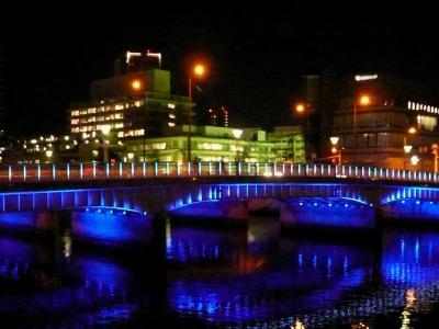 夜は、ライトアップがされて綺麗な玉江橋です。なにわ筋に架けられていて、浪速の名橋50選にも選ばれているそうです。橋の長さは上流側77.0m、下流側78.8m、幅員は10mの鋼桁橋なんだそうです。この周辺は、ランニングしている人が沢山居てはりました。