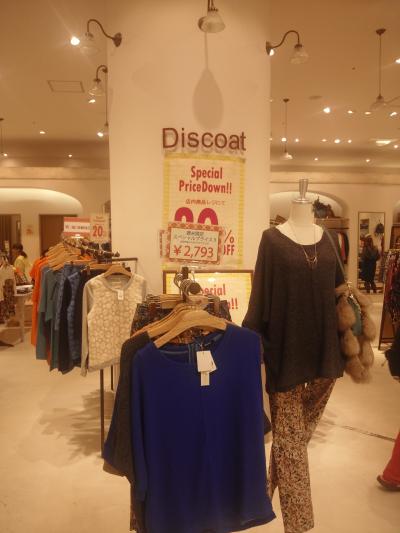 「心地よい 素材 着ごこち」「ほど良く体になじむシルエット」 “遊び心”のあるレディース カジュアルショップのディスコートです。ショップ内は丁度20%オフセール中でした。大人の女性が着るこじゃれた服が置いてありました。