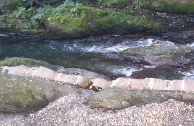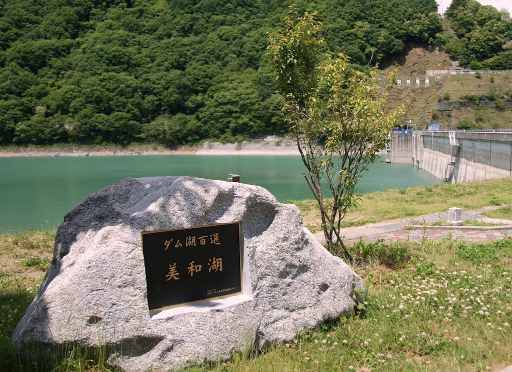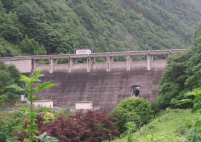 ダムの上流2キロほどのところに国指定天然記念物「横川の蛇石」があります。横川川の河床に横たわる灰褐色の岩脈で、閃緑岩に、直交する形で白色の石英脈が10~15cmの間隔で規則正しく入っており、これが蛇腹の斑紋を連想させる見事な石です。下流に横川ダムが建設されることになり、当初計画では水没してしまうおそれもあったが、地元住民の強い保全要望もあって、水没を免れたという。