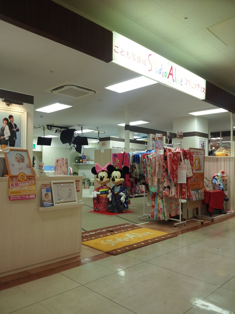 子供スタジオのスタジオアリスです。そう言えば七五三前なので店内には、ミッキーとミニーとが七五三の服を来て出迎えていました。店内には、可愛い子供の服が沢山揃えてありました。実は、子供だけでは無く大人でも写真を取ることが可能です。
