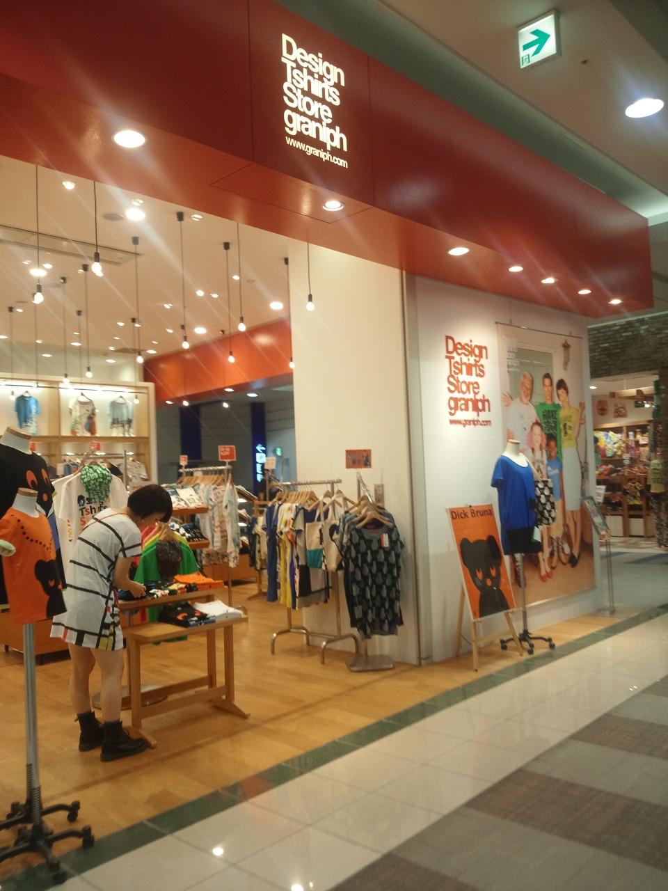 クグラフィックTシャツ専門店のグラニフです。店内にはバリエーション豊富なグラフィックTシャツが沢山置いてあります。なかなかTシャッツの専門店は珍しいので覗いてみると結構楽しいと思います。以外にこれはチョットね・・・派手目の物まで置いてあります。
