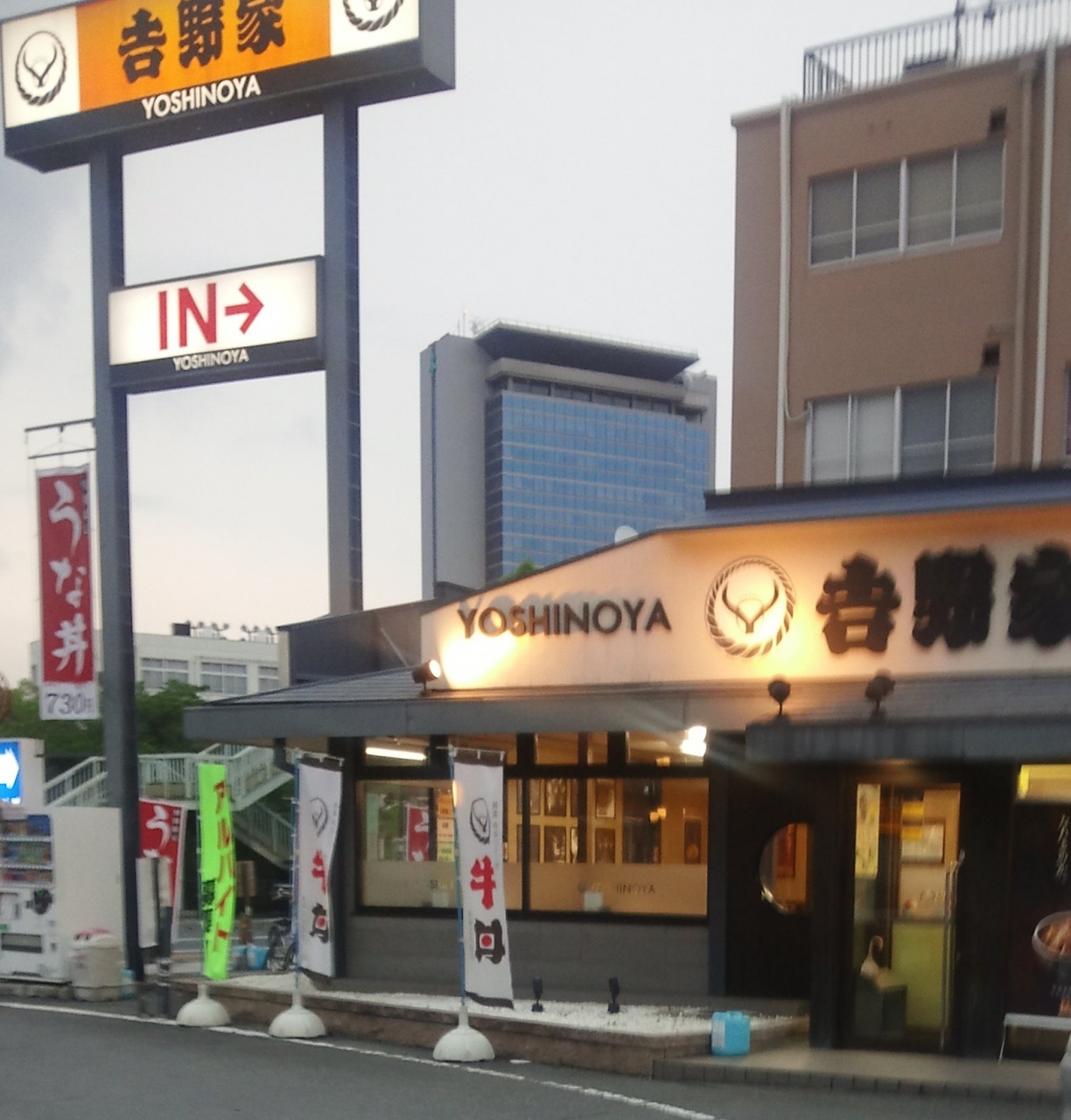 国道170号線の高槻市役所前にある、牛丼の吉野家です。駐車場は、他社と共通でめしや食堂、スタジオアリス、餃子の王将と共同でした。駐車場はほぼ満車で、吉野家も満席状態でした。さすが吉野家注文してから出てくるの早かったです。
