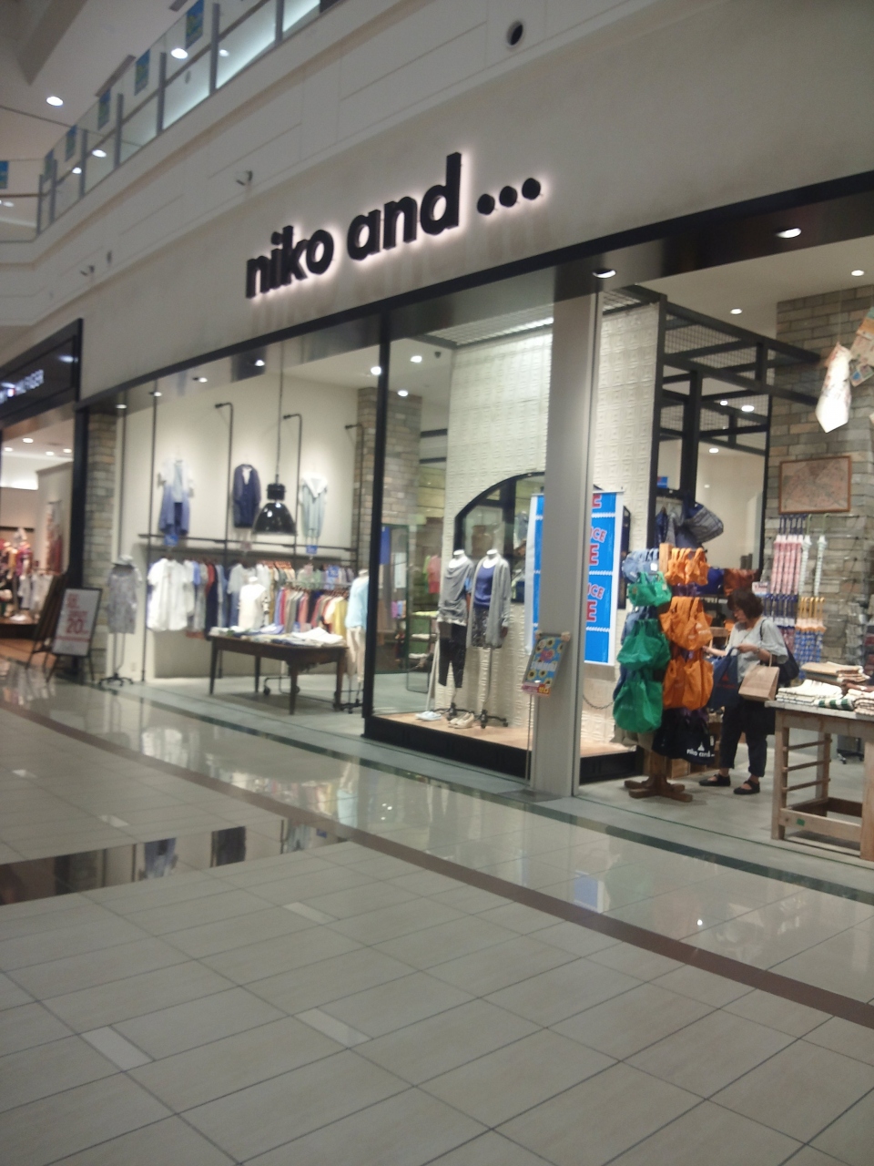 レディスファッションと生活雑貨のショップのニコアンドです。店内には、カジュアルな服が主体です。小物は、傘を初め髪留め、バック、くつなどが有りました。周りのショップは夏のラストセールが多いのでお得感はあまり無かった。