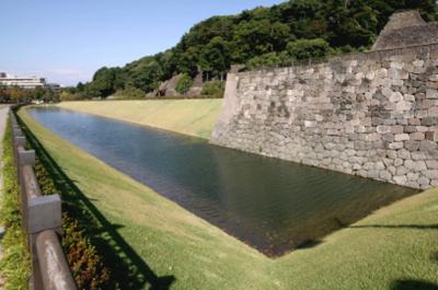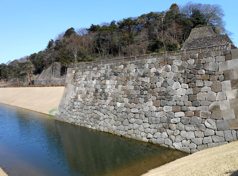かっての江戸時代の堀は、幅が広いところで約40m、深さが10m以上あり、水を湛えていました。斜面は土羽で、比較的緩やかな勾配で造られており、南東端には鯉喉櫓台の石垣があったそうです。その後埋め立てられて今は再び復元されたそうです。
