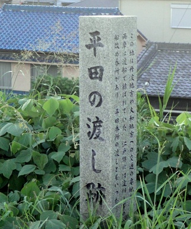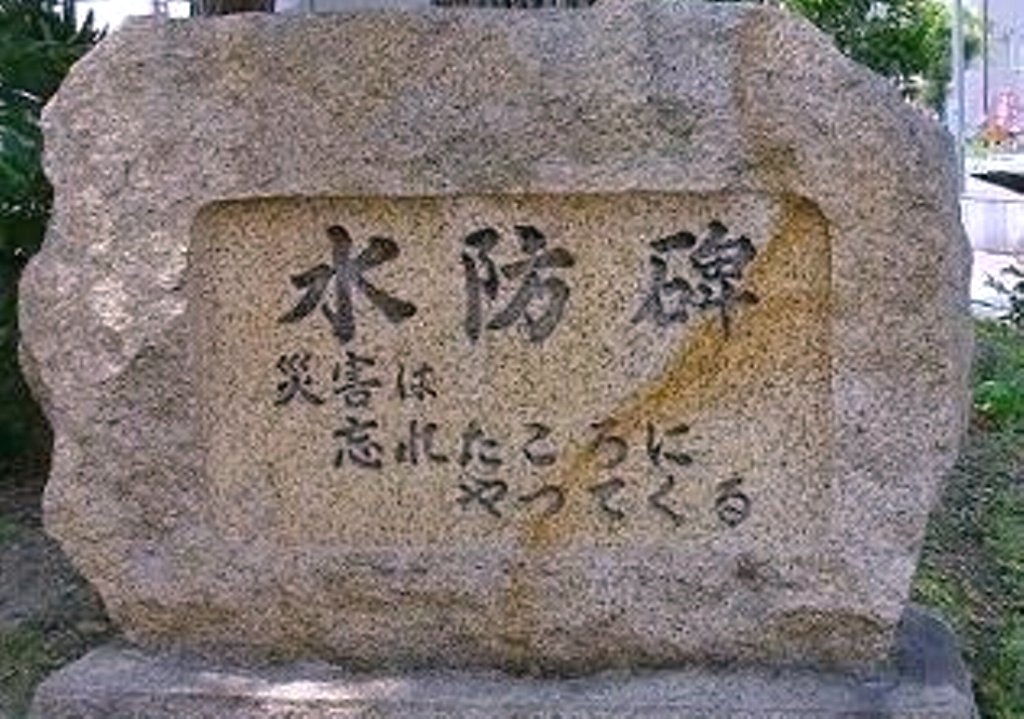 災害は忘れた頃にやってくる。このあたりは江戸時代中期から北河内地区の水防要所だったようで、わざと低めの堤防をつくって、この石碑より東側にあたる北河内地区の輪中地帯に溜まった水を大川へ戻していたそうです。
