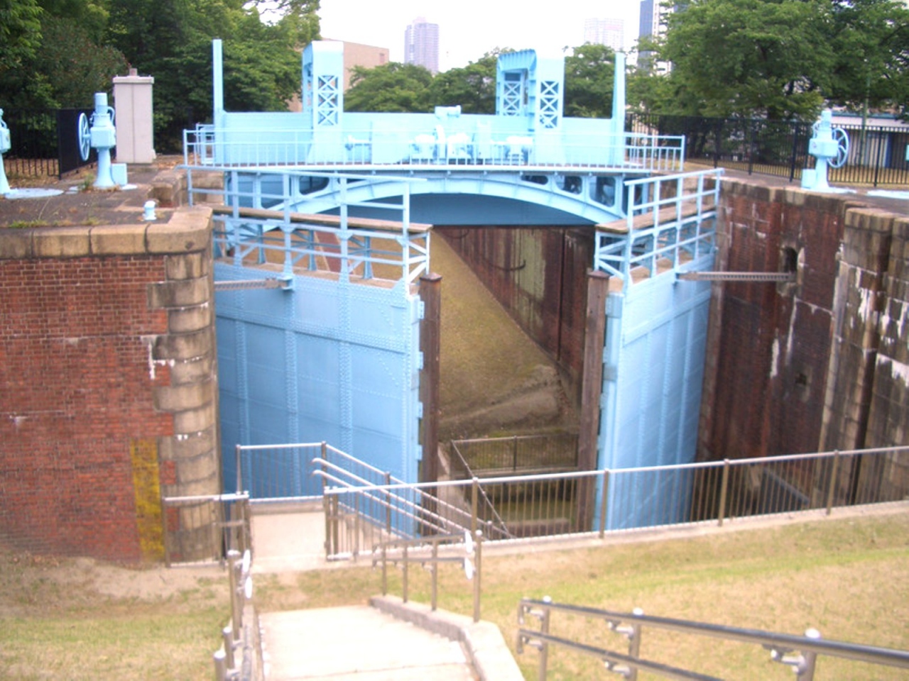 淀川は大規模な洪水が頻発し、流域の人々に甚大な被害を及ぼした。そのため明治政府は明治29年より淀川の大改修工事を開始した。毛馬においては第1閘門(明治40年竣工)と洗堰(同43年竣工)を設置し、これにより旧淀川(大川)に流れ込む水量を調節するとともに船運の利便を図った。両者共に煉瓦造で端部や要所を花崗岩貼りとする。 第1閘門は中央の閘室の前後に鉄製の両開扉を設置する構造であったが、昭和3年(1928)の改修工事により、開閉の作業を迅速に行うため、引き上げ式の鉄製扉が新設された。洗堰は9本の堰柱と両側の橋台からなり、10個の水通しをもっていた。北側3分の2が新洗堰の工事により撤去されたが、他はよく残る。周囲は公園として整備されて今に至るそうです。