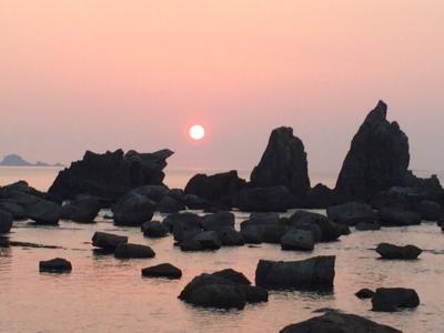 もうすぐ串本に到着すな~と思った頃に到着します。すぐにわかります。道の駅も併設しているので、休憩にももってこいです。5時ごろに到着しました。薄明りの中で朝日を待ちました。すでに3名ほどカメラマンが三脚を立てて日の出を待ち構えていました。日の出をバックに見ると良いですね。自然が作ったとは思えないような景色ですね。あさ早すぎたので売店はやっていませんでしたが、串本の帰りに通ったら、観光バスが一台止まっていて、にぎやかでしたね。それにしても海水の透明度が高くてきれいです。