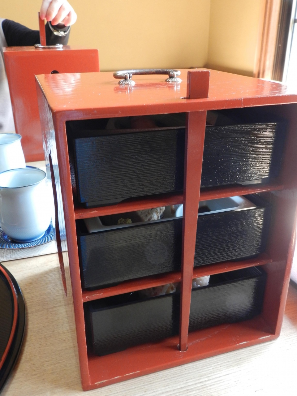 1品ずつ縦三段の重箱に収められていて、料理の見た目がとても素敵でした。