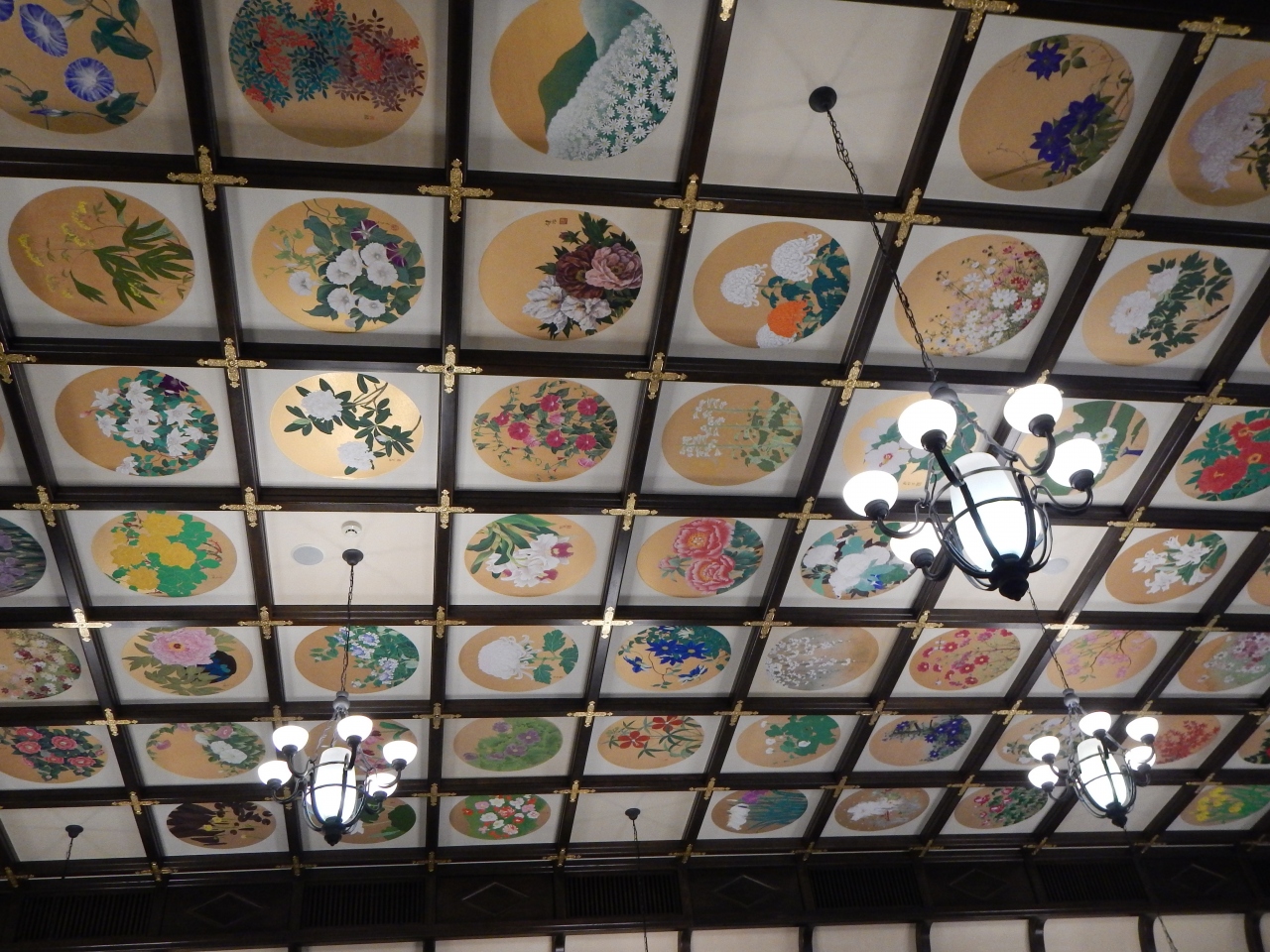 時間の関係で有料拝観区域(旧青山別邸内)には入りませんでしたが、入口を入ってすぐのところ(無料区域)にあった天井画も見応えがありました!- 旅行時期