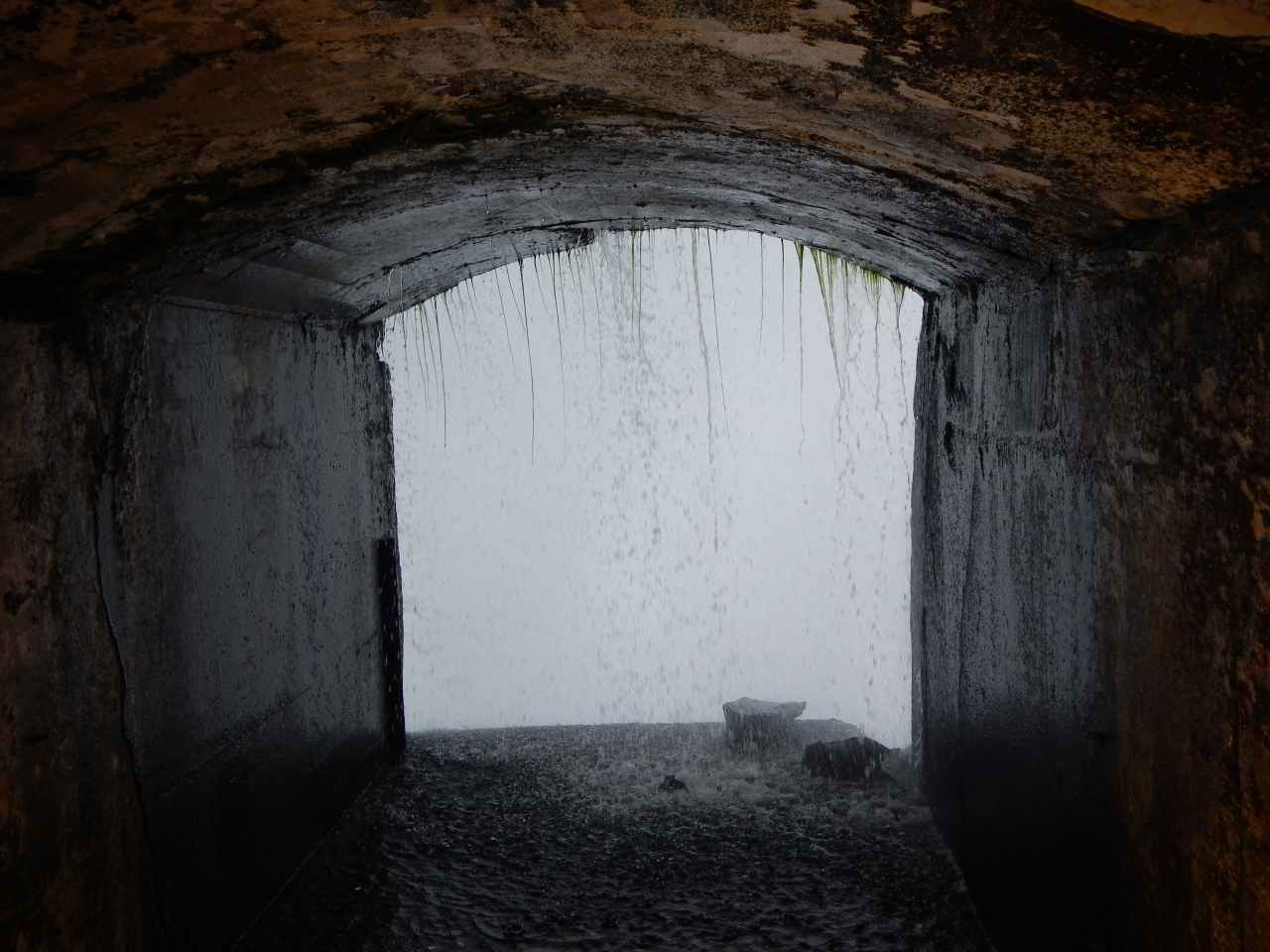 次に滝の真裏に行きます。岩盤に地下通路が掘られていて、その最深部が落下する水の裏側になっているという仕組みです。ただ、水勢が強すぎて"水しぶきが見えるだけの窓"という感じでした。