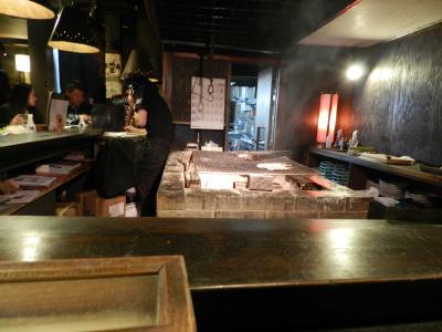 店に入ると中央に炉があってその周りにカウンター席が配置されています。グループ客は2Fにも席があってそちらに案内されていたようですが、私たち夫婦はカウンター席に座りました。