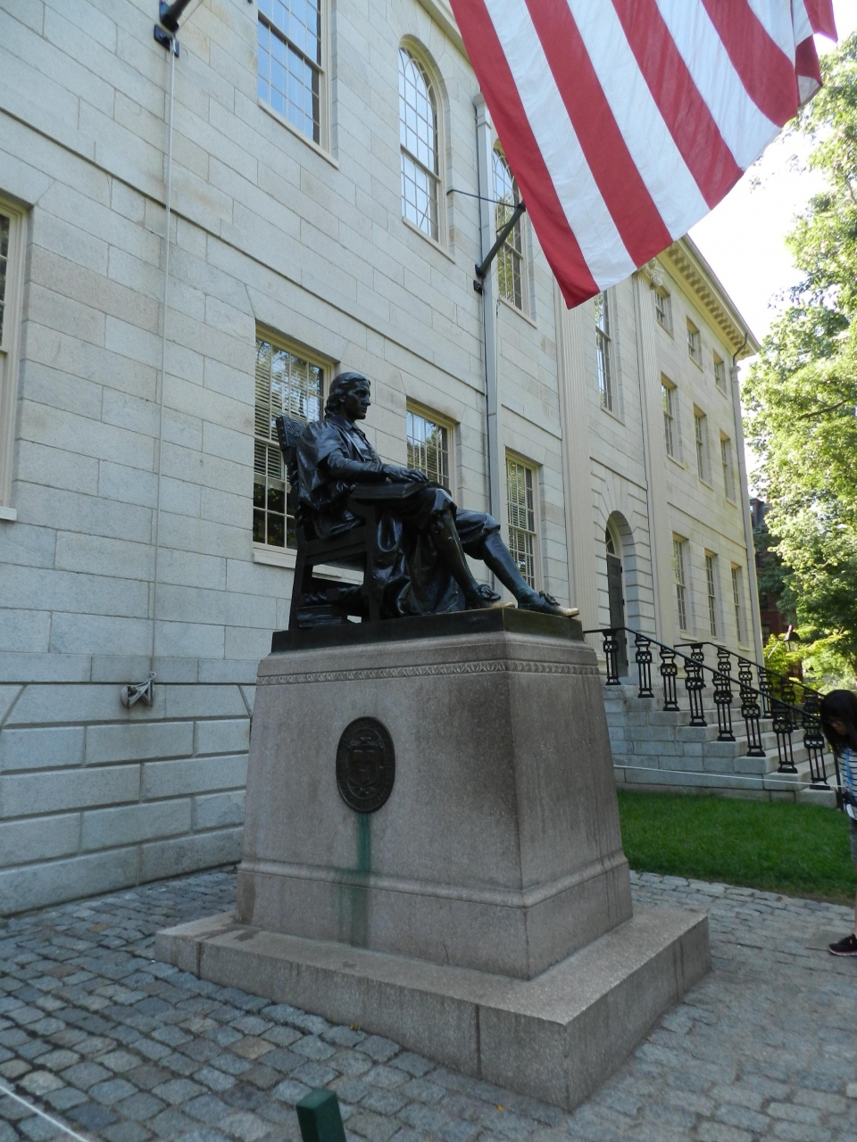 ユニバーシティホールの正面には星条旗の下に座っているジョン・ハーバードの銅像があります。「銅像の足に触れると幸運が訪れる、頭が良くなる」などの言い伝えがあって、銅像の左足部分の色がピカピカに光っていました。