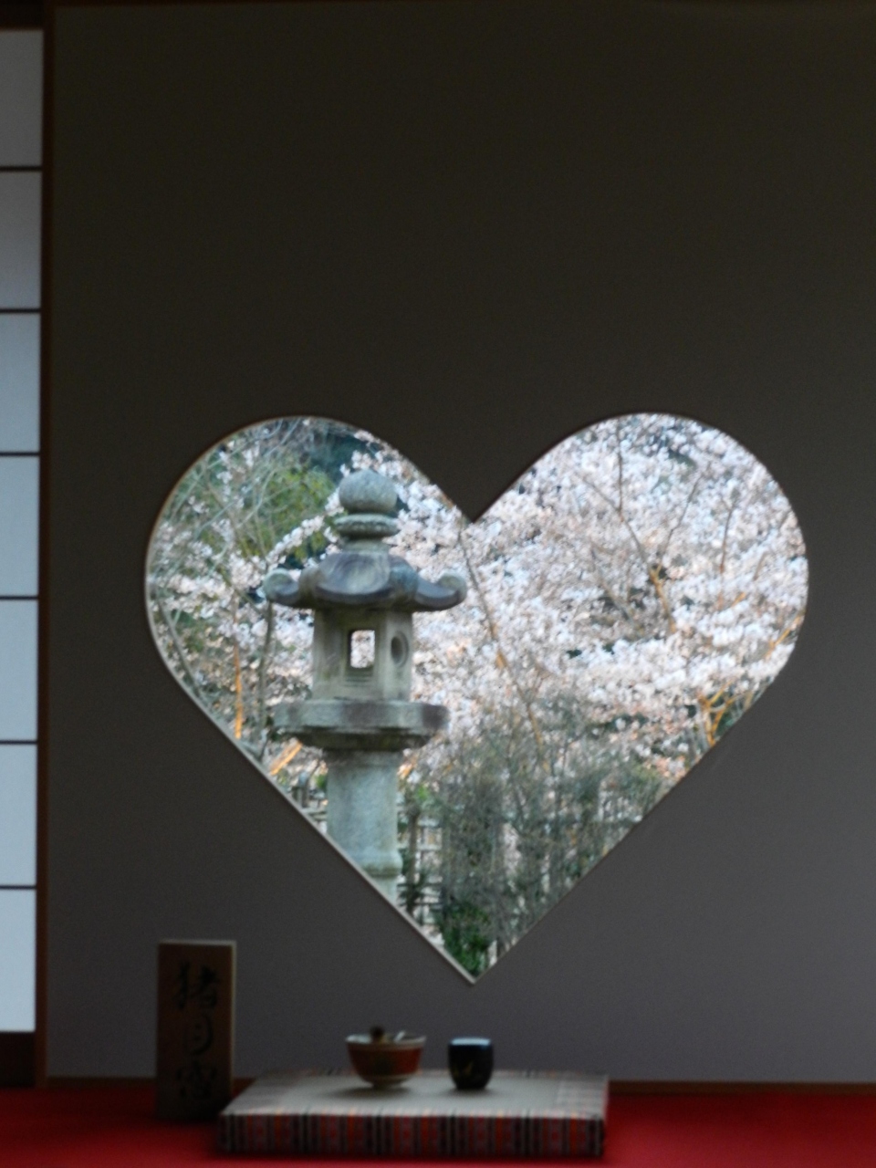 「ハートの窓」は、正式には「猪目窓」といい、客殿と呼ばれる建物の中にあります。その窓を通して桜の花やモミジが見られるようになっています。