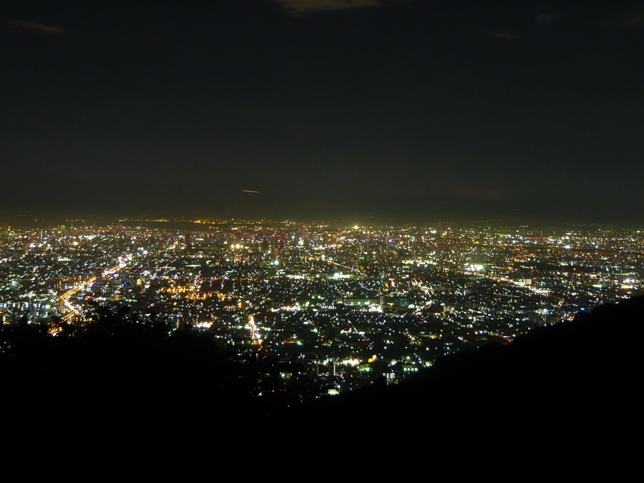 大阪の夜景が見える場所は、市内中心部の高いビル等を除くと、生駒山と伊丹空港に向けて着陸態勢にある飛行機の中くらいしかありません。