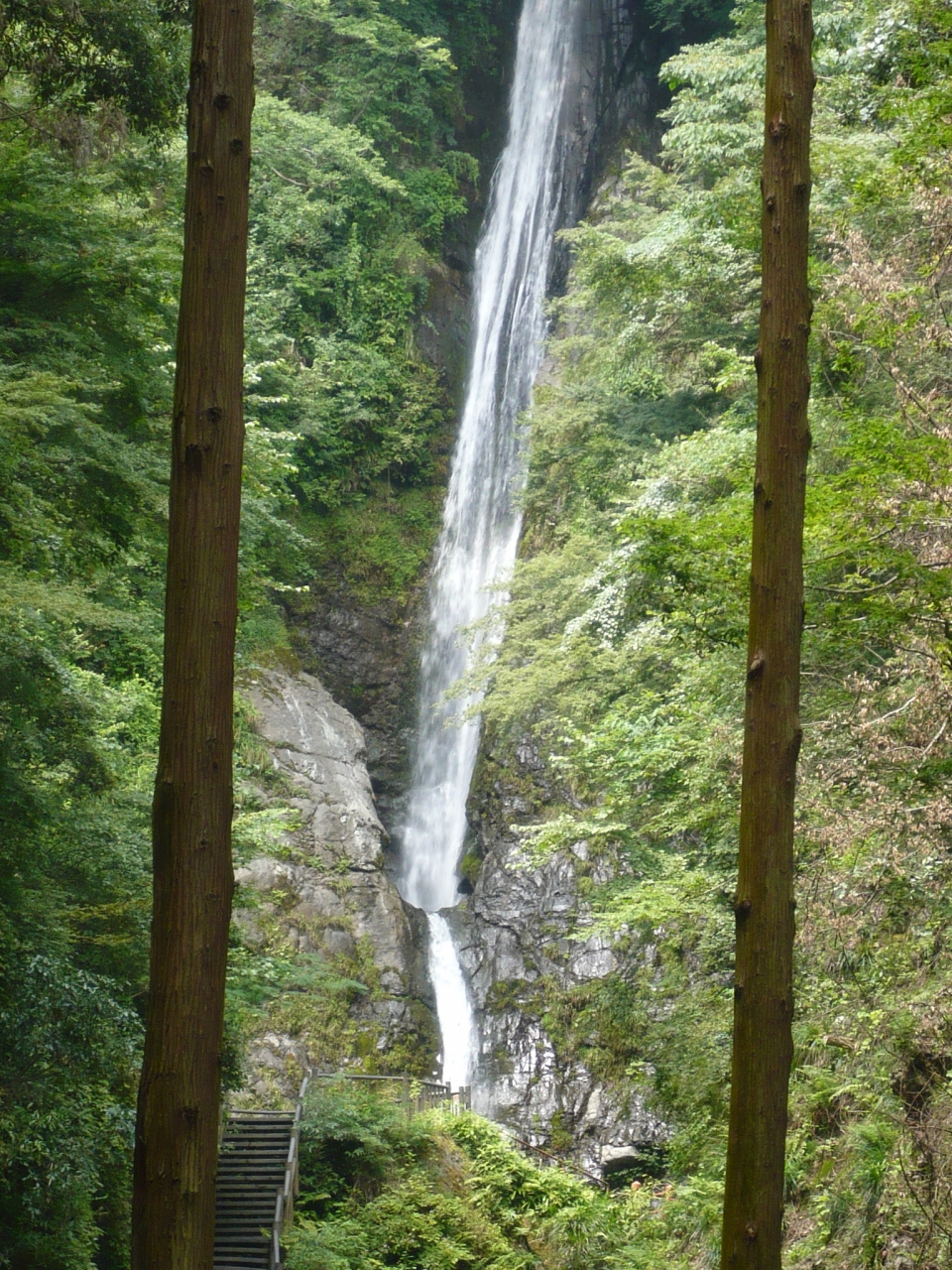 落差8m位の直瀑ですが、末広がり気味に落ちる姿は美しく、また濃緑色の水をたたえる深く大きい滝壺も見応えがあります。