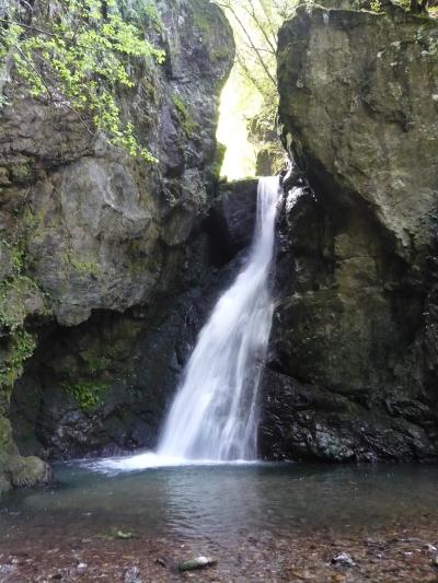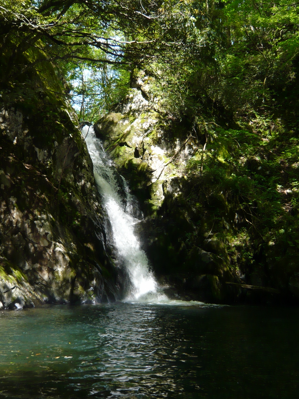 落差は10m程度ですが、滝壺は美しい深緑の澄んだ水をたたえ、周りの苔むした岩々も含んで神秘的な雰囲気があります。