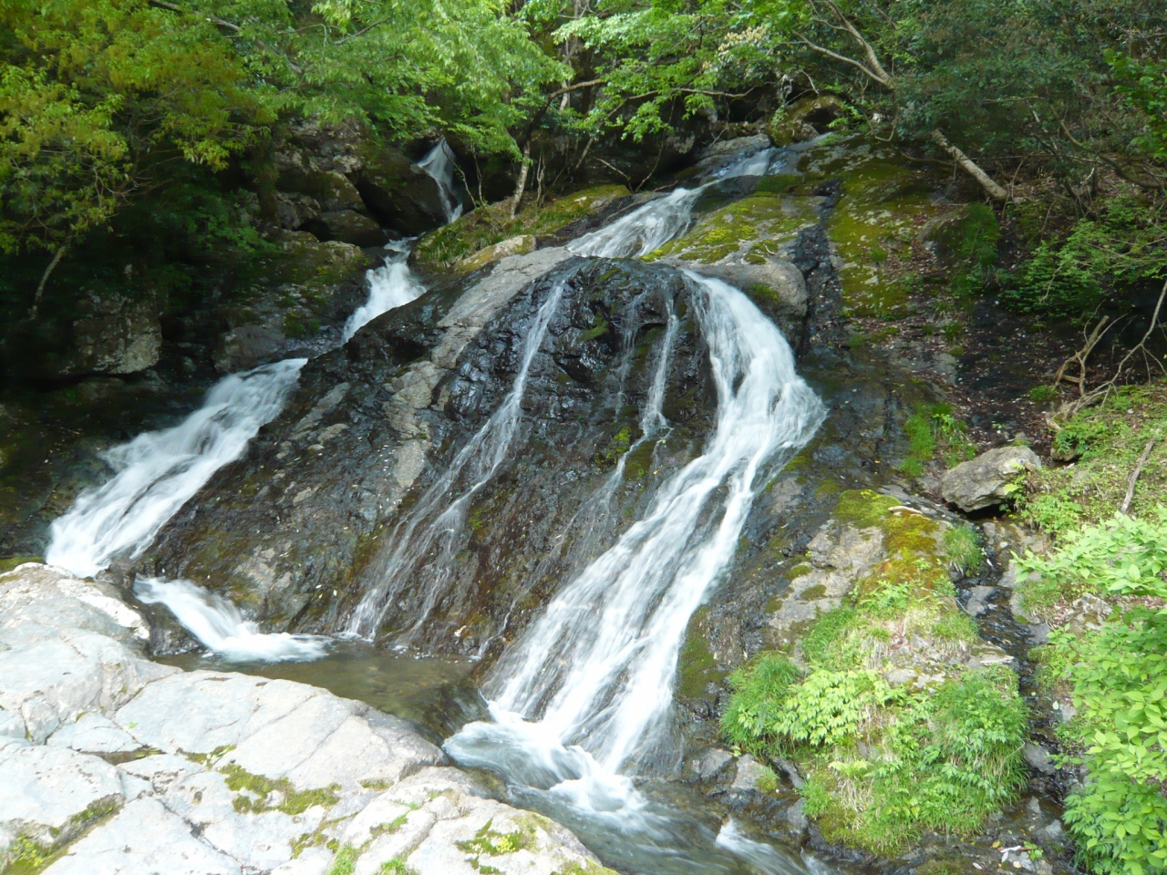 複雑な凹凸の岩盤を複雑に流れ落ちているため、色々な角度から見て楽しい滝です。