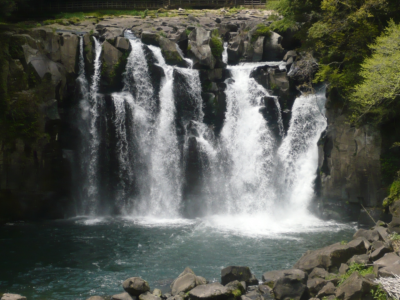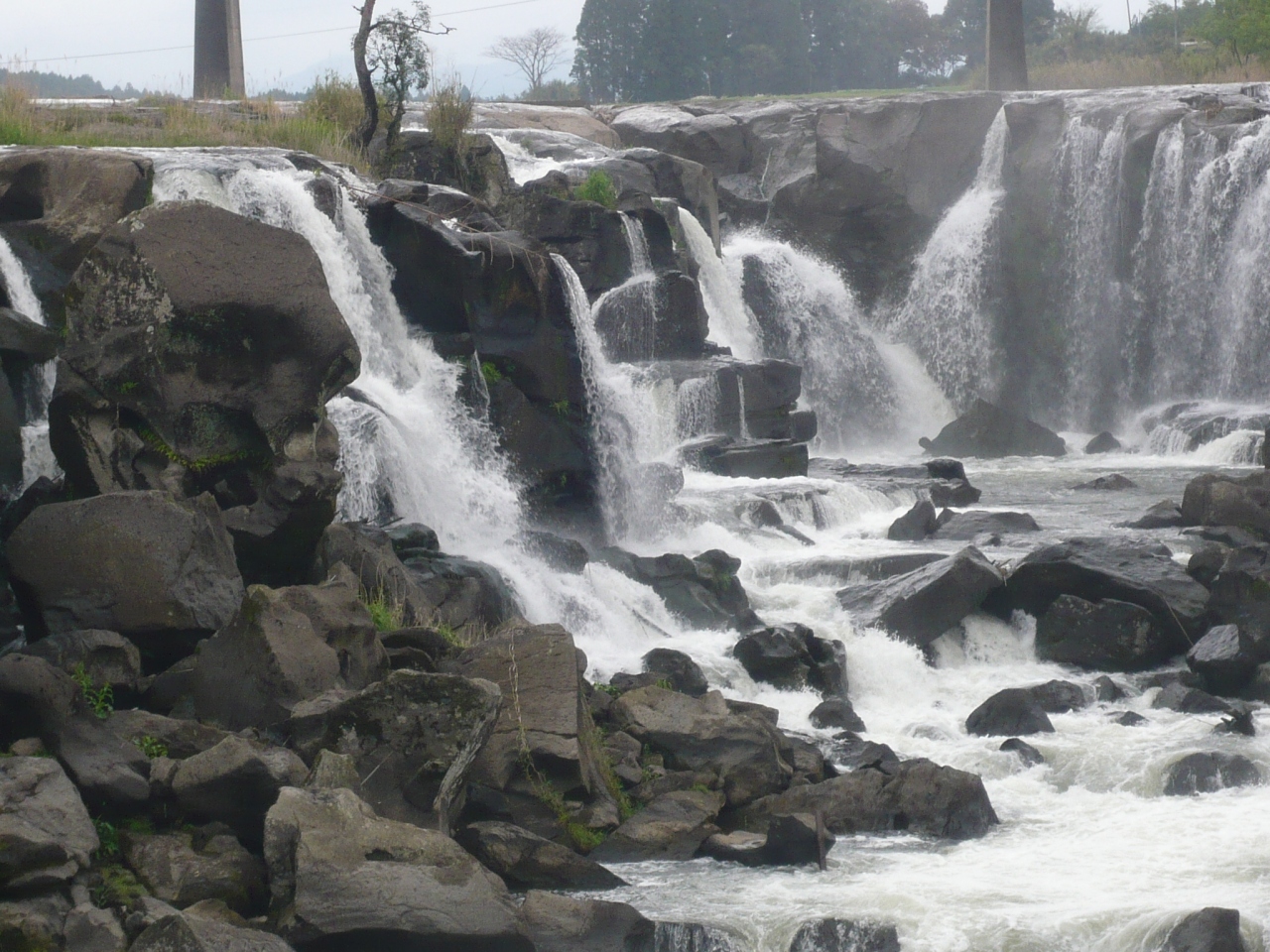 落差15m幅60mの分岐瀑で、幾筋にも分かれて滝水が落ちる様はとても勇壮です。約10km下流にある「関之尾滝」に姿形が似ているように感じます。