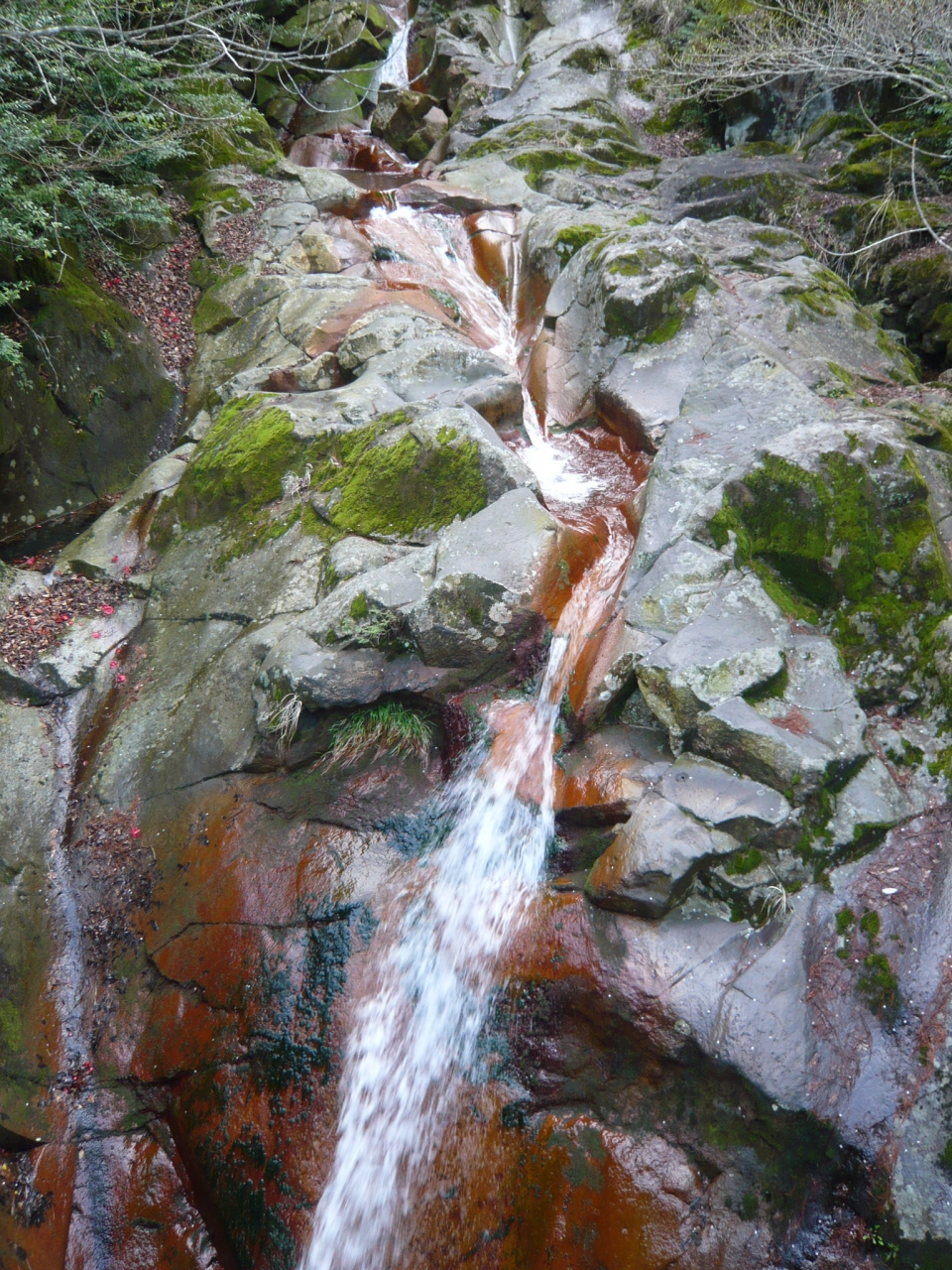 滝水に含まれる鉄分のために、水が流れる部分の岩盤が赤くなっているのが特徴的です。