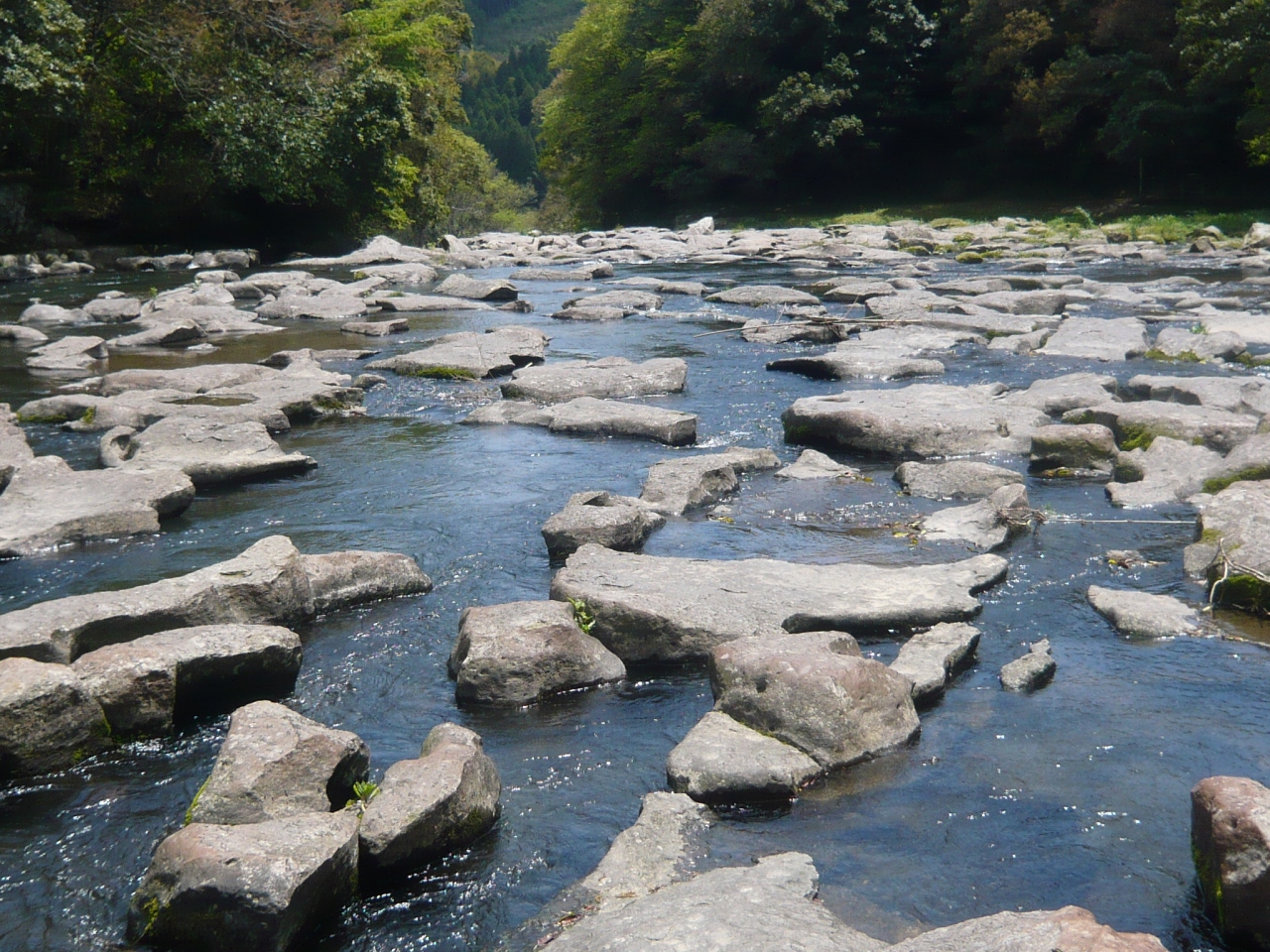 日本の滝百選「関之尾滝」のすぐ上流にある、『関之尾甌穴群』は国の天然記念物に指定されています。