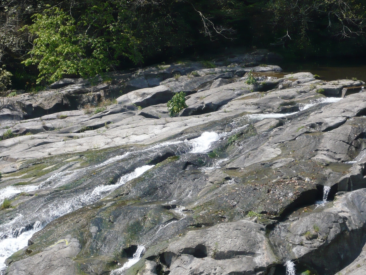 千足川本流が洗濯板のような岩盤上を滑るように流れ、岩盤は縞状に侵食されているので、たくさんの雨樋を水が流れているように見えます。