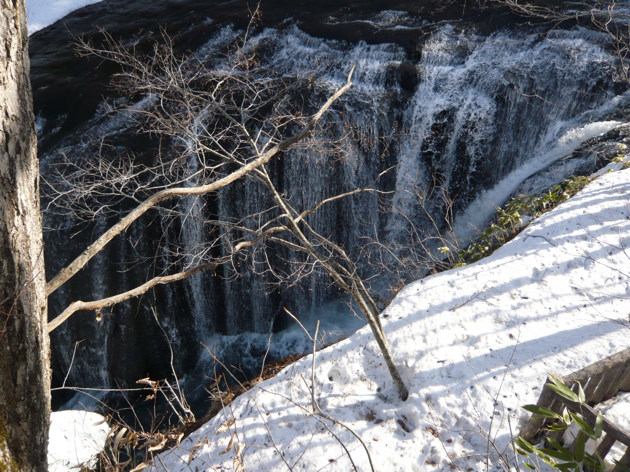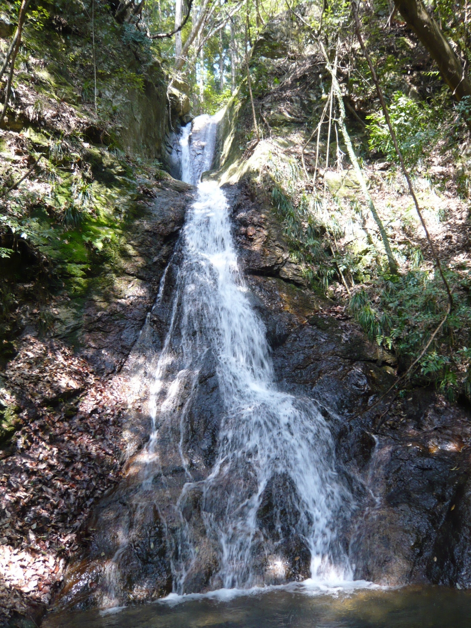 落差は7〜8m位ですが、私が訪れた日の水量は豊富で見応えがありました。左からの流れと右からの流れが滝の中央部で"?字状"に交差しているという珍しい形の滝です。