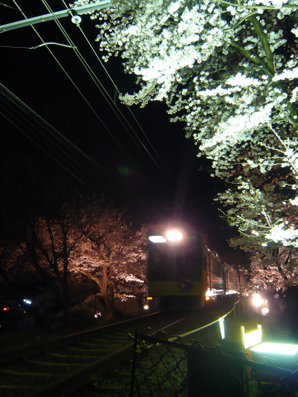 ライトアップ期間中、通過する電車は車内の灯りを消し、桜のトンネルを徐行運転で通過します。