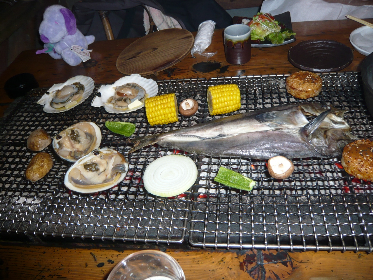 サラダ、タラバガニの身がたっぷり入ったスープ(味噌味)、焼きおにぎり、ホッケ、大きな貝が2種類、じゃがいも、とうもろこし、野菜tec.が付いていました。