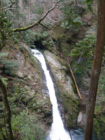 入口から崖に作られた階段道を下りると「三の滝」が見えます。