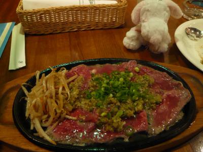 私がいただいた「ねぎ塩焼ステーキ」は薄切のステーキをアツアツの鉄板で出してくれます(写真)。さっぱりとした塩味はなななかイケます。