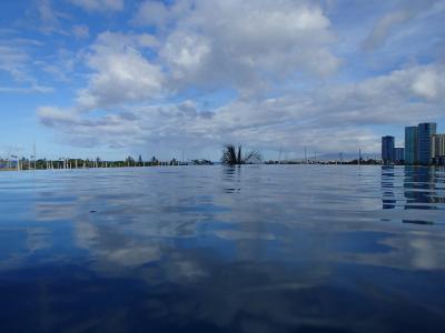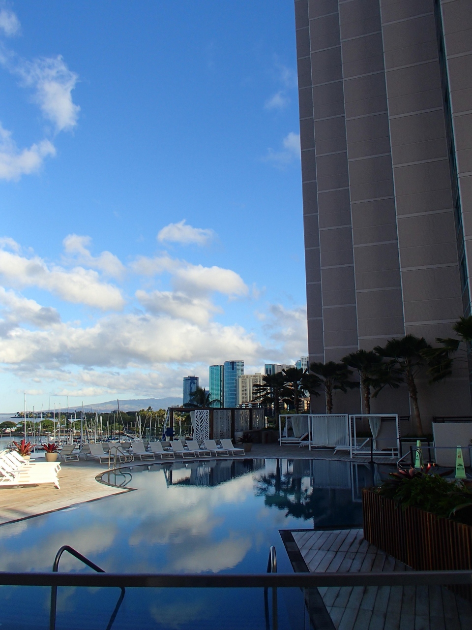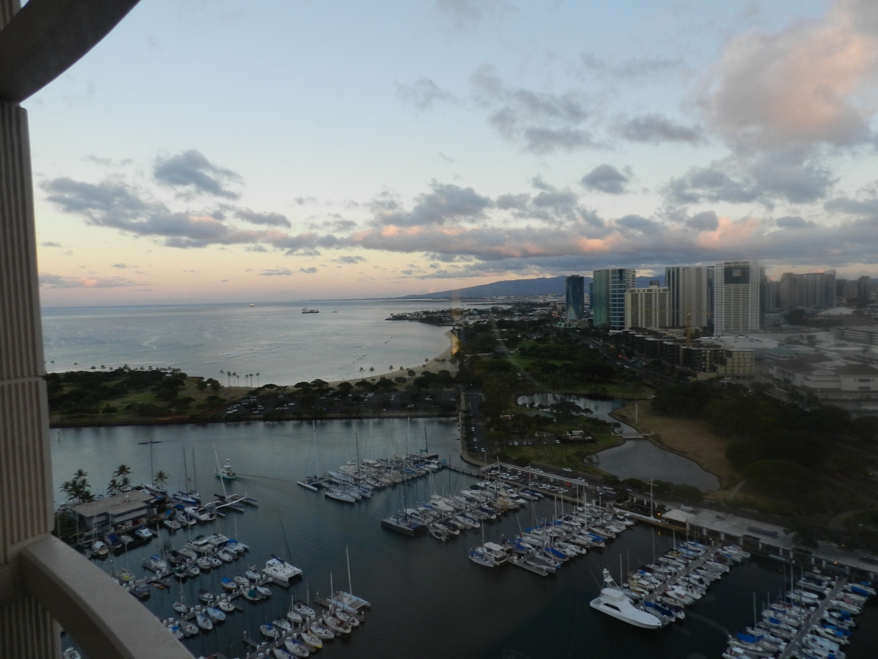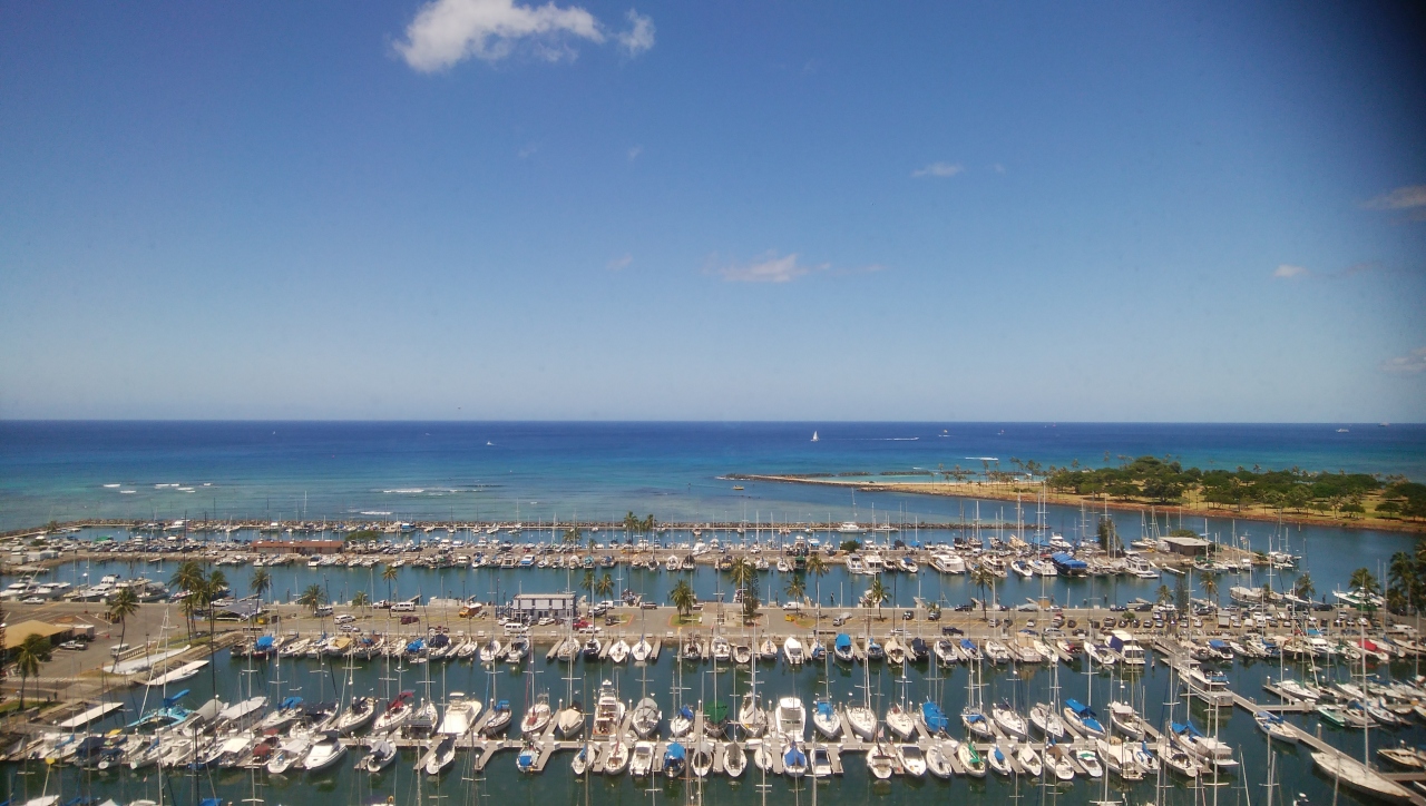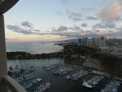 部屋からの眺望は、目の前がヨットハーバー、その向こうがオーシャンです。アラモアナセンターも一望できました。