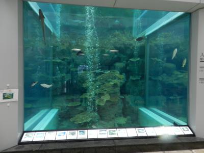 入口を入ると中央に「サンゴ礁大水槽」と名付けられた水槽があり、四方から魚たちを見ることができます。