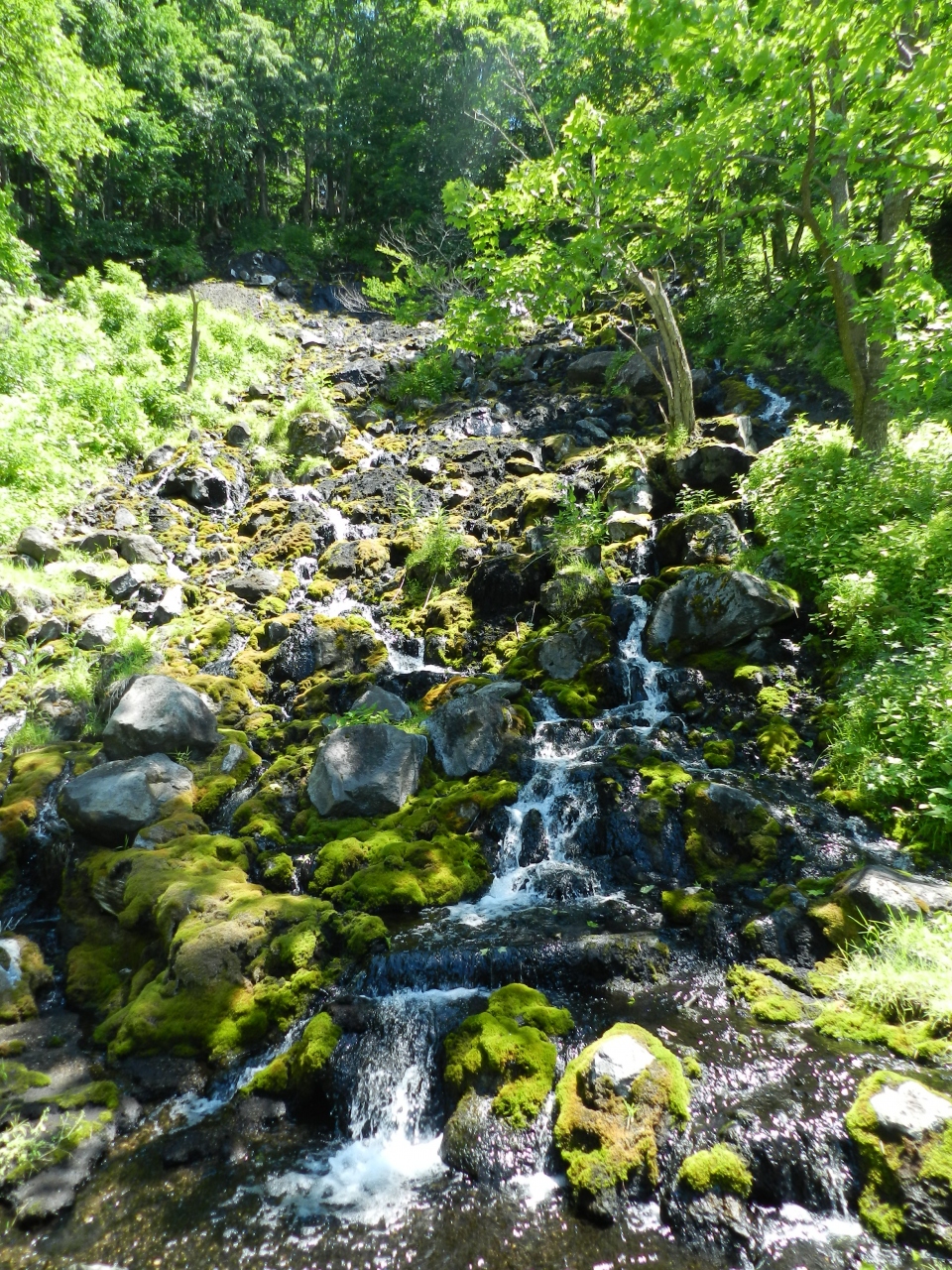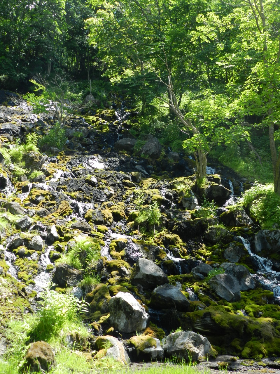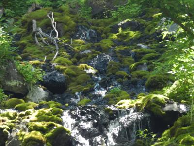 水量こそ多くありませんが、ゴツゴツした真っ黒な岩の間を白い滝水が流れる姿は繊細で美しく、神秘的な雰囲気がします。