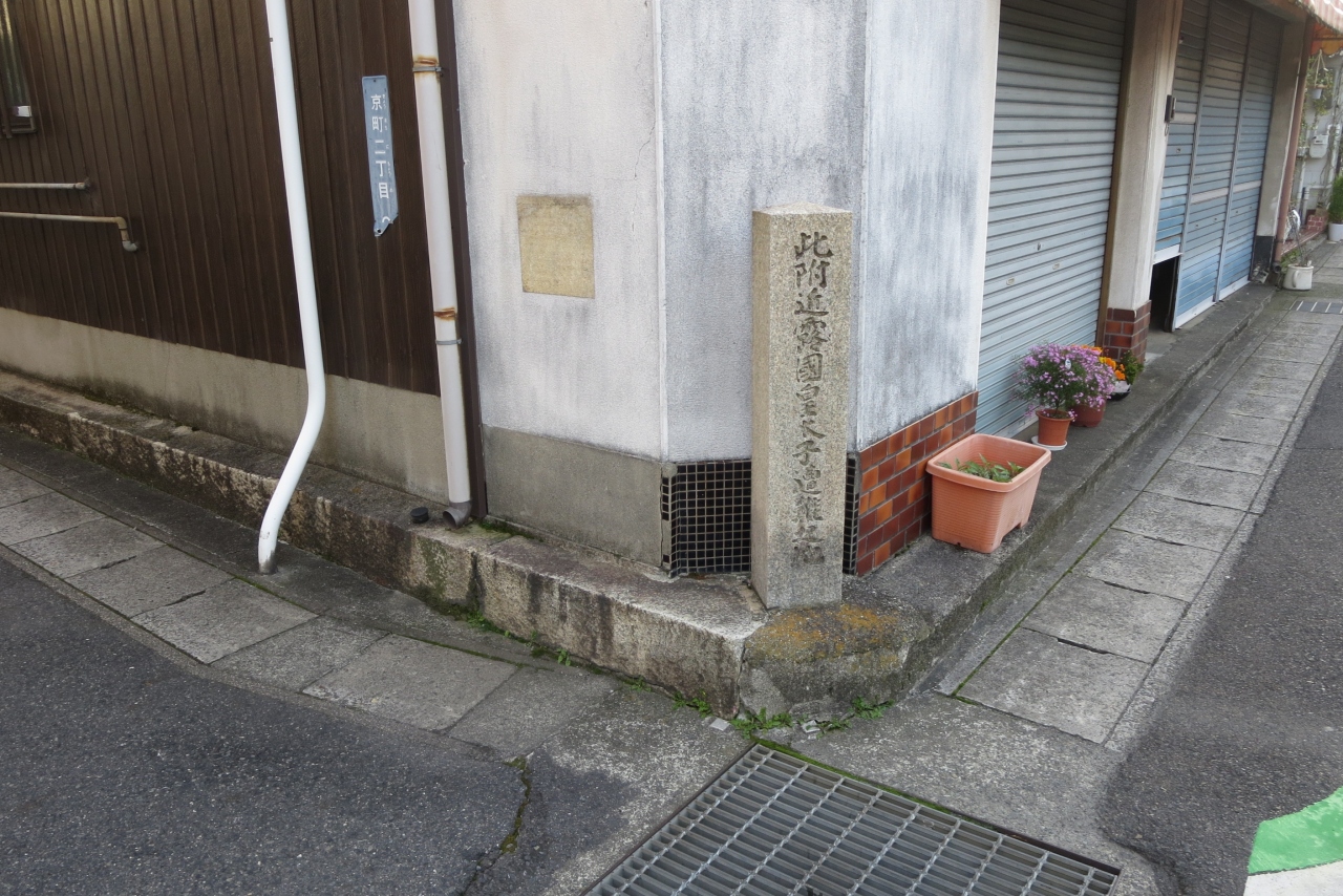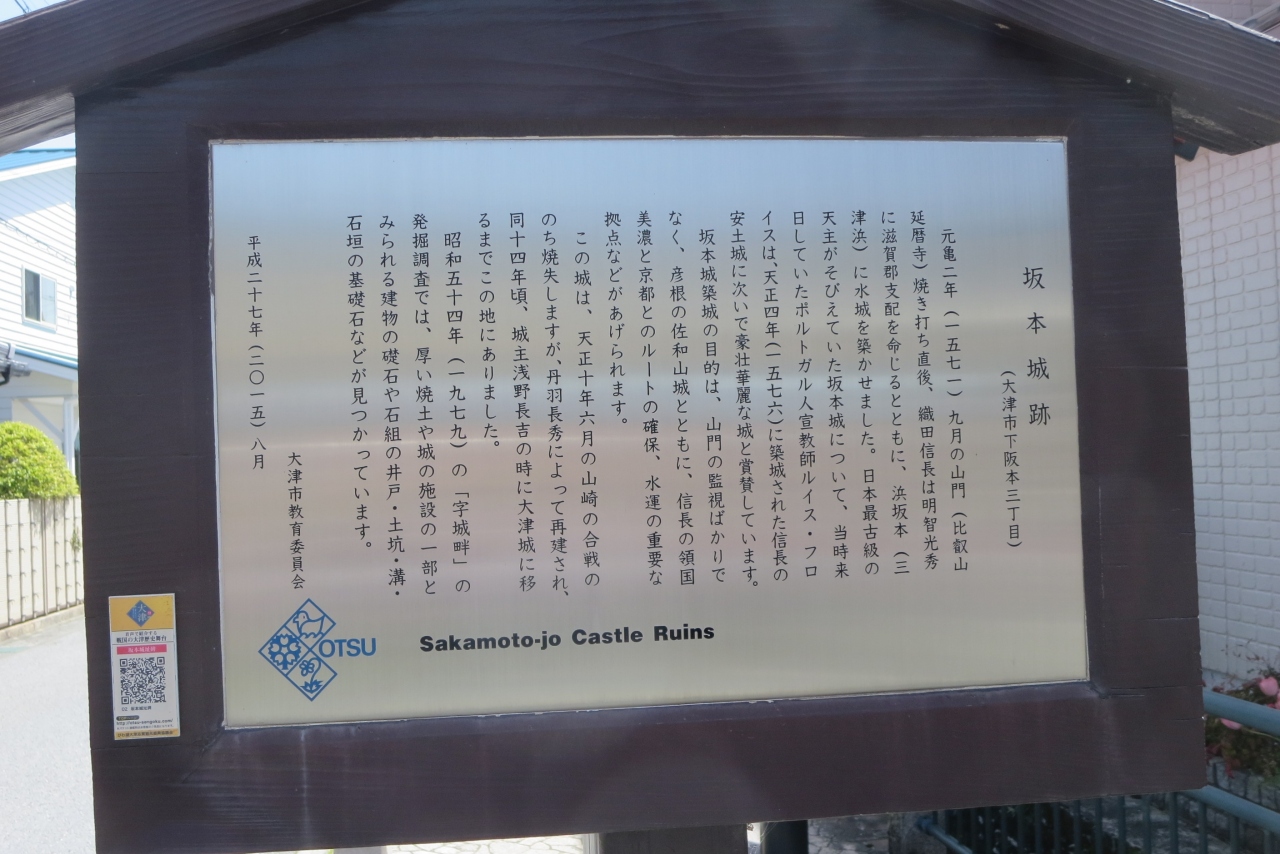 大津市下阪本の旧道から東南寺に曲がる角に坂本城の唯一の痕跡である坂本城址碑があります。明智光秀が築城した城で、琵琶湖の湖水を利用した水城だったようです。大天守、小天守がある名城だったようです。この城は比叡山の監視するためと西近江路、坂本港の交通の要衝であったことから非常に重要な地点でもありました。明智光秀は山崎の合戦で羽柴秀吉に敗れた後、明智秀満が城に火を放ち、討ち死にしました。遺構の一部は琵琶湖の水面下にあり少し残されているようですが、もちろん目にすることはできません。