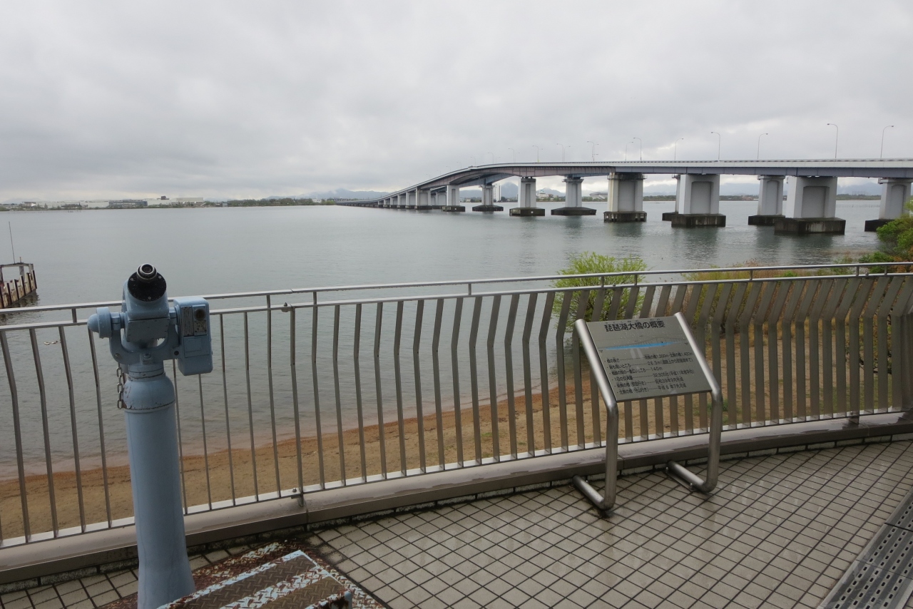 大津市と守山市の間に架けられた国道477号の橋です。琵琶湖はこの橋より北側を北湖、南側は南湖と呼ばれています。琵琶湖の湖西と湖東を結び交通の時間短縮に役立っています。橋の中間部は下を船舶が航行できるように高く、水面上26.3 mあるそうです。橋の長さは上下線で異なりますが約1400mあります。片側二車線ずつあり、通行料は普通車150円ですが、自転車や歩行者は歩道を使って無料で往来できます。