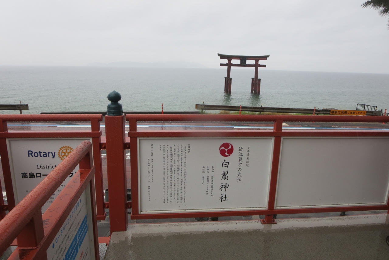 近江最古とされる神社で2千円前に創建されたそうです。ご祭神は猿田彦命です。社名のとおり、延命長寿の神様として知られ、縁結び、子授け、開運招福、学業成就、交通安全、航海安全などのご利益があるそうです。社殿は豊臣秀吉の遺命によって、秀頼が片桐且元に命じ造営したものです。その後、明治時代に拝殿は再建されています。琵琶湖の水平線に浮かぶ沖島を背景とした湖中にある朱塗りが人気観光スポットです。境内から琵琶湖側への道路横断は過去に死亡事故もあったそうで大変危険なので地元ライオンズクラブが寄贈した鳥居展望台があります。