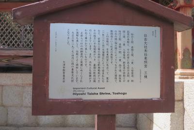 各地にある日吉神社、日枝神社、山王神社などの社名の神社は日吉大社から勧請を受けた神社です。これら神社の総本宮が日吉大社になります。延暦寺門前町坂本の鎮守神社でもあります。境内は東本宮と西本宮の二区域からなり、東本宮は八王子山の大山咋神を祀ったものです。西本宮は大津京遷都の時に奈良県三輪山より大己貴神社の勧請を受けたもので、宇佐神宮の姫神を祀る宇佐宮、加賀国白山比神社から勧請した白山宮などがあります。ともに本殿は日吉造で国宝になっています。また石橋で重要文化財に指定されたのは珍しい日吉三橋、猿の彫刻がある朱色の西本宮楼門、山王鳥居など多くの重要文化財があります。社殿の多くは織田信長による比叡山焼き討ち以後、江戸時代初期に再建、建立されたものです。訪れた日は山王祭が催されていて、無料でお参りできました。