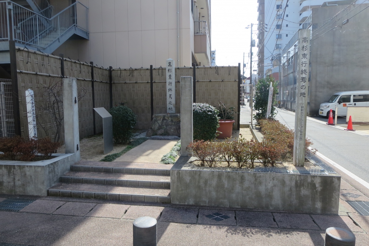 厳島神社の前からまっすぐ南に向かう路地のような細い道に厳島神社の一の鳥居があります。さらに南に向かうと、高杉東行終焉の地と書かれた碑が建てられています。尊攘派の志士で奇兵隊を創設。長州藩を倒幕運動に傾け明治維新の原動力にした人物です。1867年5月17日に肺結核でなくなります。臨終に際し両親、妻、息子を始め、野村望東尼、後の山縣有朋が立ち会ったそうです。