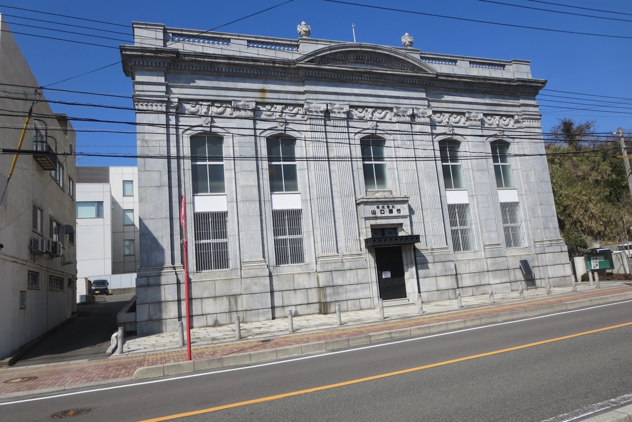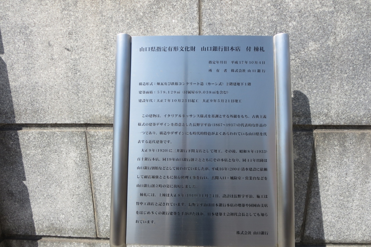東京駅を設計した辰野金吾の弟子で、日本建築士会初代会長を務めた建築家長野宇平治の設計監督のもとに1920年に三井銀行下関支店として建設されました。1933年に山口銀行の前身となる百十銀行の本店となりました。1944年山口銀行の創立から新本店ができる間は本店として使用されてきた建物です。建物の外観は重厚感のあるルネサンス様式を取り入れたもので左右対称に造られています。御影石が使われた外観には彫刻がある本格的な古典主義建築です。内部は銀行らしくロビーも広くカウンターや金庫も残されています。2階には当時の頭取室や応接室などもあります。