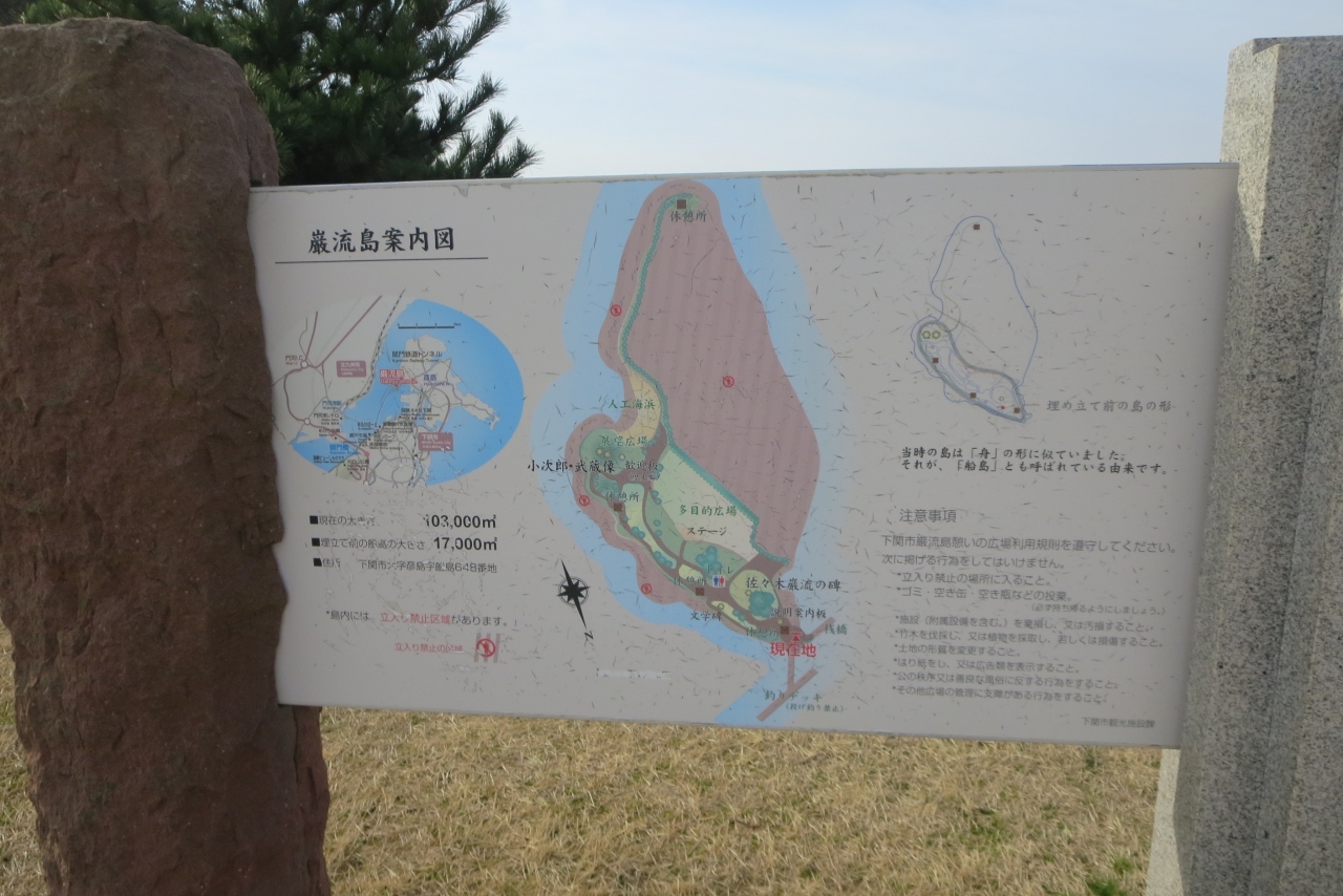 何度も関門海峡を渡っていますが、都度あそこが巌流島かと思いながらなかなか行けませんでした。やっと下関に行った折に天気もよかったので唐戸桟橋から船で訪れることができました。朝一番の船は唐戸桟橋9:05出発です。10分で到着しますが、次の戻る船は9:35です。ゆっくりできないので、その次の船10:15分にしました。これだと島で1時間滞在できます。巌流島の桟橋から佐々木巌流の碑→武蔵を巌流島まで乗せたような伝馬船がある人工海浜→武蔵・小次郎の決闘を再現した像→関門橋までよく見える展望広場→巌流島文学碑→桟橋。これで1時間は不要ですので桟橋付近でしばらく帰りの船を待つことになりました。