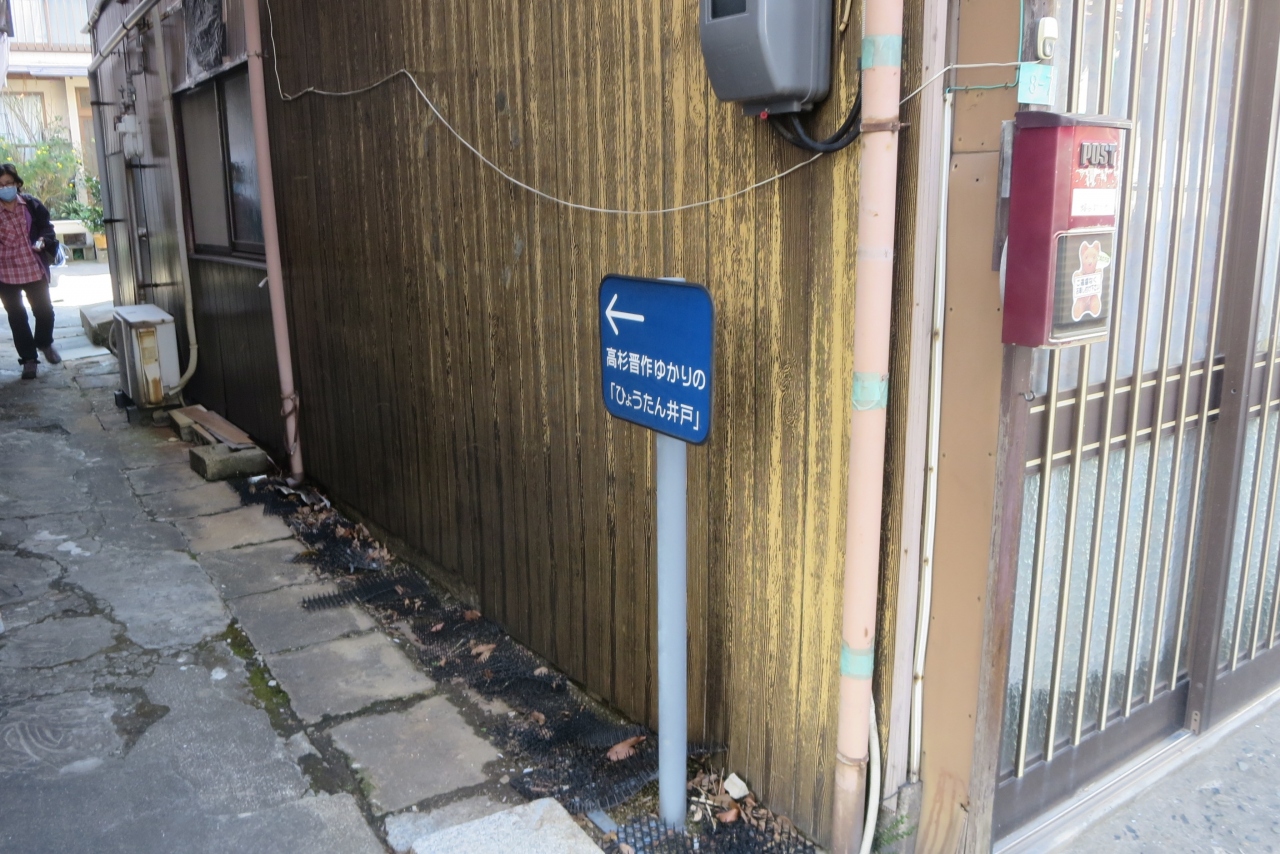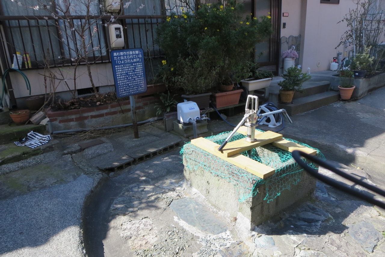 下関駅から歩いて行ける伊勢崎町の路地裏にある井戸です。一方通行の細い路地に建つ家の間を抜けると民家の玄関先にあります。現在は様変わりしてポンプまで付けられています。第一次長州征伐後は長州藩の親幕府派(俗論党)が政権を握りますが、高杉晋作は長州藩の政権を奪い返し、藩はもとの倒幕路線に戻ります。高杉は下関港を開き、貿易によって経済力を増し対幕府戦に備えようとします。しかし長州藩内の攘夷論者は変節した高杉の命を狙うようになります。この井戸は高杉が下関で潜伏生活を続けていた時に刺客から身を隠したところと言われています。