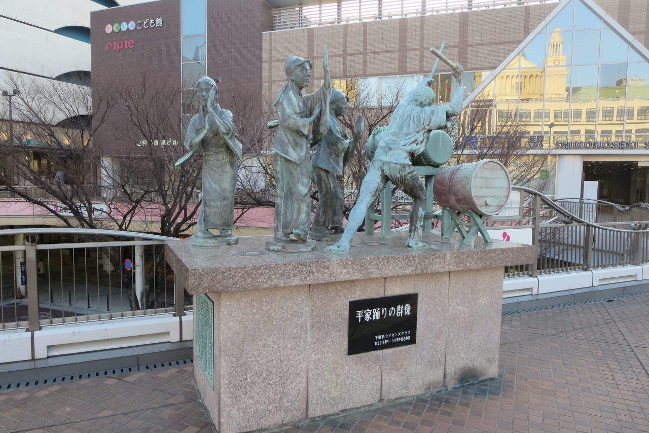平家踊りは源平合戦最後の壇ノ浦の戦いに敗れ、入水し崩御した幼い安徳天皇や平家一門の霊を弔うために始まった踊りです。毎年夏に開かれる「しものせき馬関まつり」で踊られるこの踊りを題材にした像がJR下関駅前の陸橋の上にあります。4人の男女が踊ったり太鼓を叩いたり、躍動感のある像です。