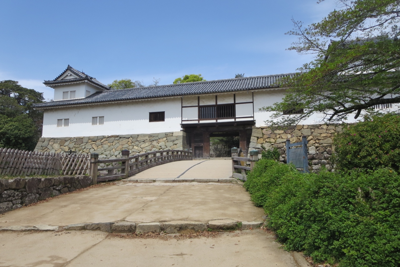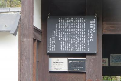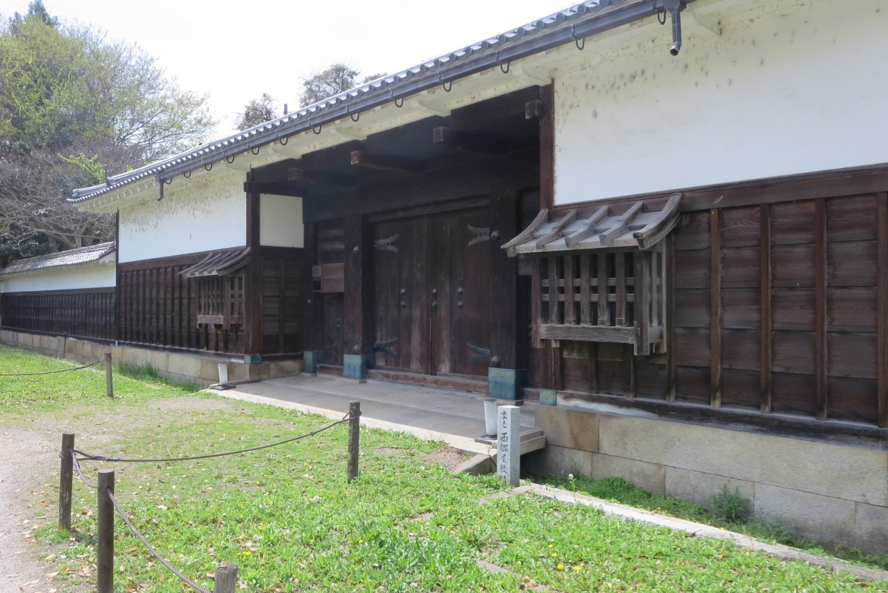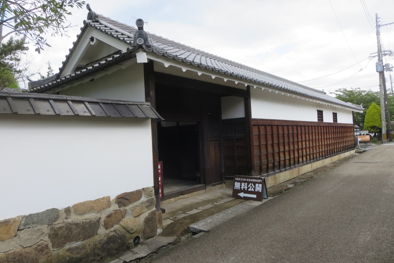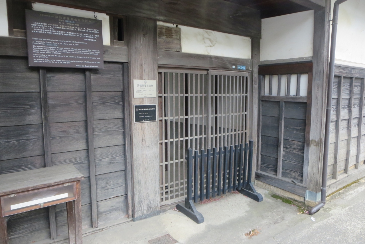 いろは松から中堀沿いに歩いて行くと井伊直弼が青年期に暮らした埋木舎があります。さらに50mほど歩くと旧池田屋敷長屋門があります。一帯はかっては彦根藩の中級武家屋敷があった地域です。このクラスの武家屋敷の典型的な長屋門として市の文化財に指定されています。解体修理が行われたときの調査では、馬屋の跡が見つかったので復旧時には馬屋も復元されています。