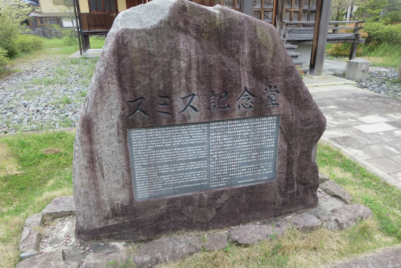 彦根高等商業学校(現在の滋賀大学経済学部)の英語教師であったパーシー・スミスさんが両親への感謝の気持ちと日米の平和交流を願って1931年に多くの献金を集めて建設したキリスト教教会堂です。特徴はキリスト教教会堂としては珍しい和風を取り入れた建築です。彦根城をモチーフにした火灯窓や破風に和洋風の意匠(両開き扉にぶどうの蔓が絡んだ十字架や松竹梅の文様)があります。現在のスミス記念堂は道路拡幅工事により、一度解体され再建築されたものだそうです。