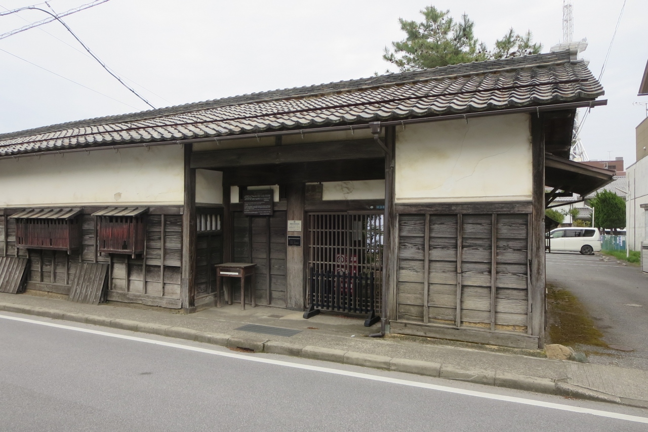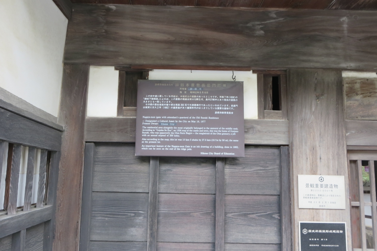 彦根城中堀の東側、彦根藩の中級武家屋敷が並んでいた地区に残されています。鈴木家は石高350石で彦根藩の350石で彦根藩の藩校の事務長のような仕事をしていたようです。当時の屋敷の敷地はかなり広かったようですが、現在はこの長屋門しか残っていません。建物の上部は白漆喰が塗られ、下部は板張りになっています。門の位置は中央ではなく右側に偏っています。内部は見られませんが、おそらくは他の長屋門と同じように武家奉公人、女中などが住む部屋、馬屋、物置などに使われたんだろうと想像します。