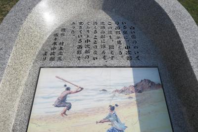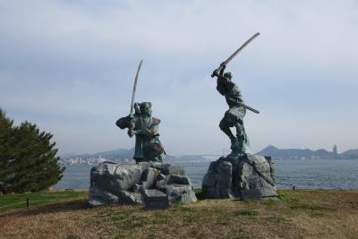 何度も関門海峡を渡っていますが、都度あそこが巌流島かと思いながらなかなか行けませんでした。やっと下関に行った折に天気もよかったので唐戸桟橋から船で訪れることができました。朝一番の船は唐戸桟橋9:05出発です。10分で到着しますが、次の戻る船は9:35です。ゆっくりできないので、その次の船10:15分にしました。これだと島で1時間滞在できます。巌流島の桟橋から佐々木巌流の碑→武蔵を巌流島まで乗せたような伝馬船がある人工海浜→武蔵・小次郎の決闘を再現した像→関門橋までよく見える展望広場→巌流島文学碑→桟橋。これで1時間は不要ですので桟橋付近でしばらく帰りの船を待つことになりました。