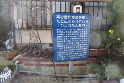 下関駅から歩いて行ける伊勢崎町の路地裏にある井戸です。一方通行の細い路地に建つ家の間を抜けると民家の玄関先にあります。現在は様変わりしてポンプまで付けられています。第一次長州征伐後は長州藩の親幕府派(俗論党)が政権を握りますが、高杉晋作は長州藩の政権を奪い返し、藩はもとの倒幕路線に戻ります。高杉は下関港を開き、貿易によって経済力を増し対幕府戦に備えようとします。しかし長州藩内の攘夷論者は変節した高杉の命を狙うようになります。この井戸は高杉が下関で潜伏生活を続けていた時に刺客から身を隠したところと言われています。