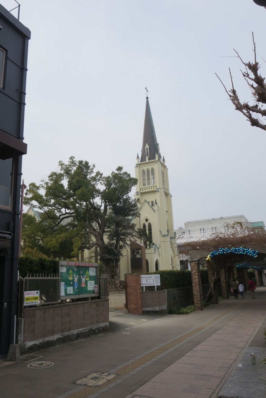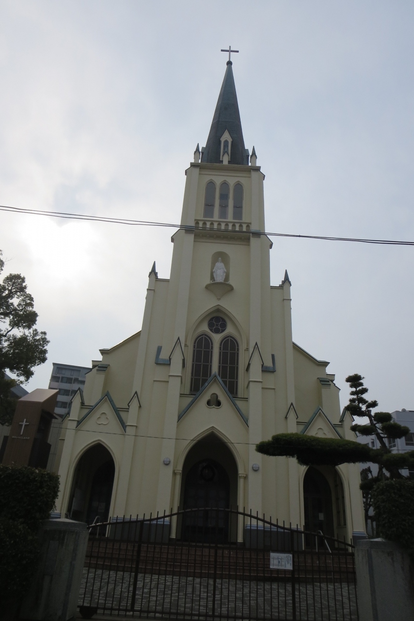 久留米市の昭和通り、六ツ門近くを歩いていると間違いなく目を引くのが、久留米カトリック教会の建物です。ゴシック様式を取り入れた尖塔は存在感があり大変きれいです。すぐ隣に幼稚園がありますので、子供たちの元気な声が聞こえてきました。平日は門が閉じられ外部者は立ち入れないようにしてあります。