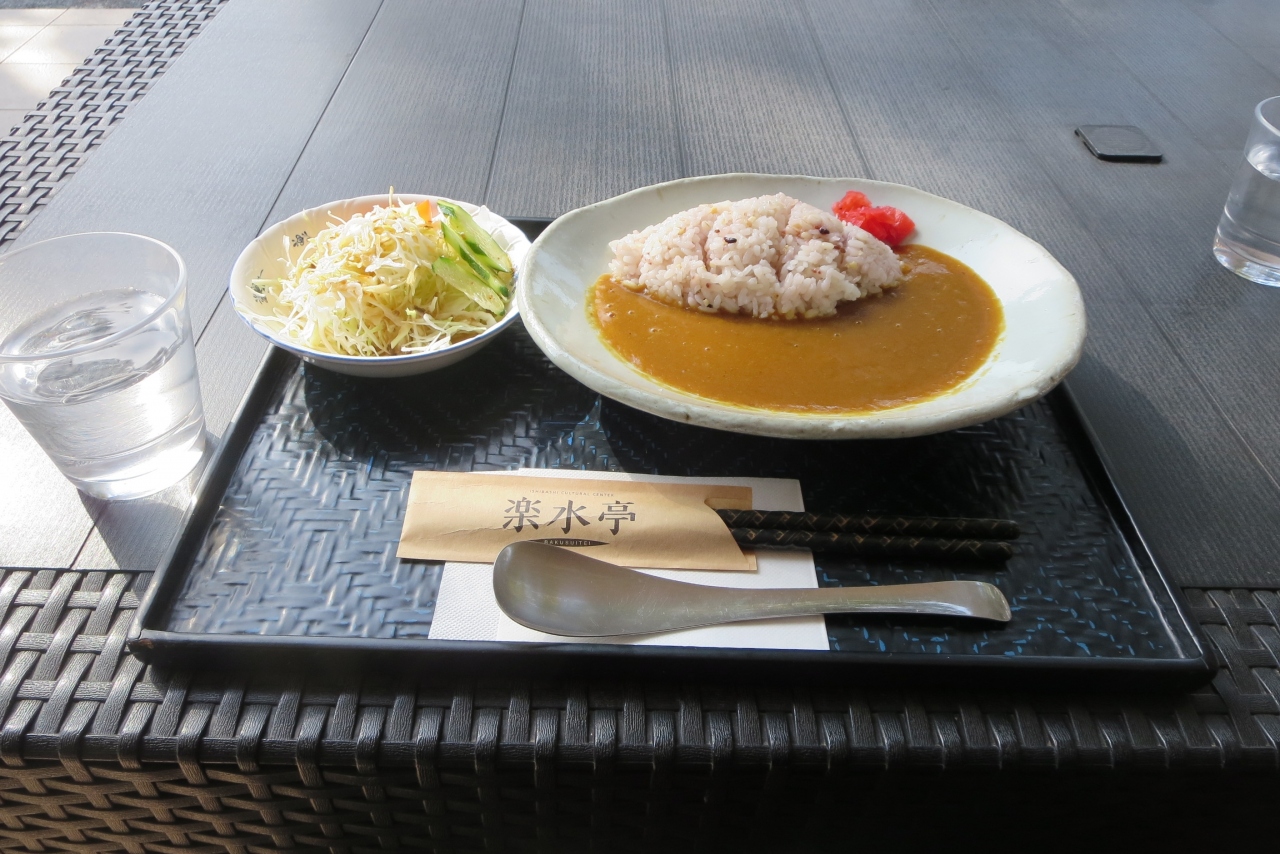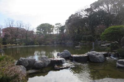 石橋文化センターの左手にある図書館の横を少し歩くと日本庭園があります。日本庭園は池を中心にした回遊式になっていて、高さ5mほどの人工滝もあります。公園の手入れはこれ以上にないくらい手入れがなされていて、落ち着いた気分で散策できます。池のほとりには「楽水亭」というレストランがあり、公園の景色を見ながら食事ができます。非常に人気があるので多くの方が待っていました。待つのが嫌なのと、寒くなかったので屋外テラス席で食事をしました。