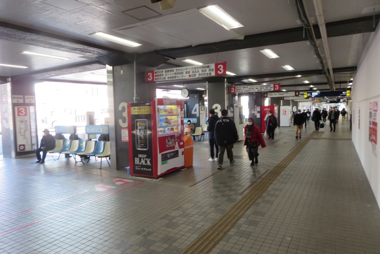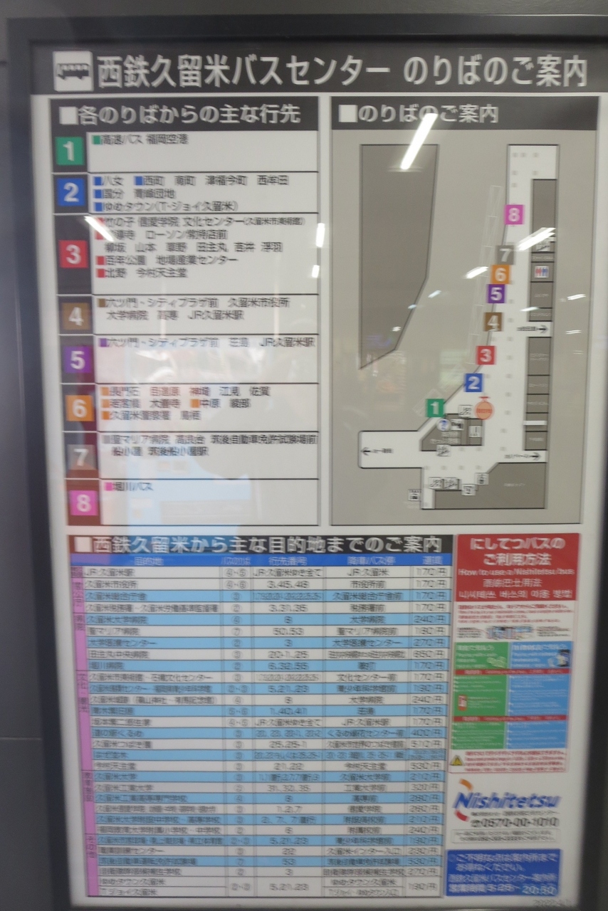 西鉄久留米駅西口1階にバスセンターがあります。柱に大きく番号が書かれていますが、1番乗り場からは高速バス福岡空港、2番は八女など、3番は市内の頭部や浮羽方面などと番号で行き先がしっかり別れています。アナログ的ですが非常にわかりやすい表示だと思います。以前は大阪や名古屋方面、宮崎や鹿児島方面の長距離夜行バスがありましたが、現在は夜行バスの発着はなくなっています。